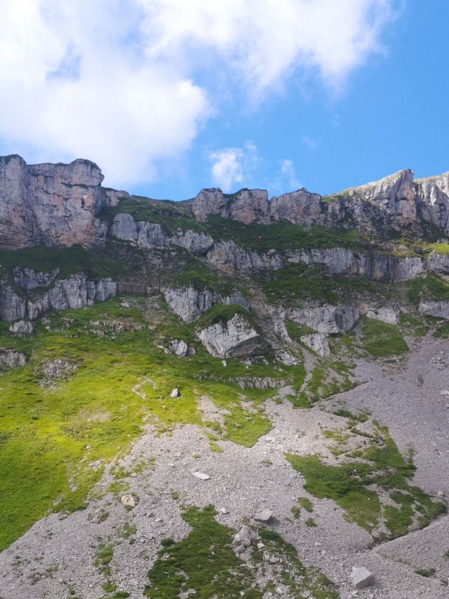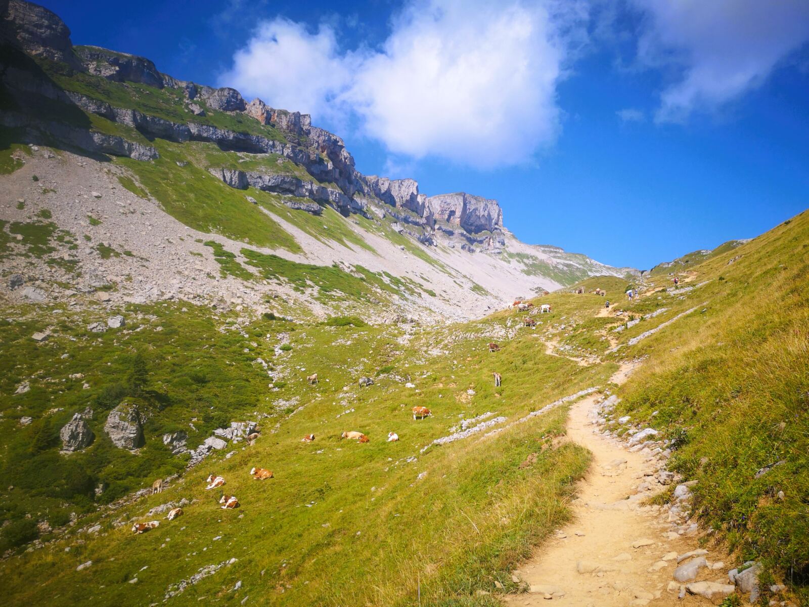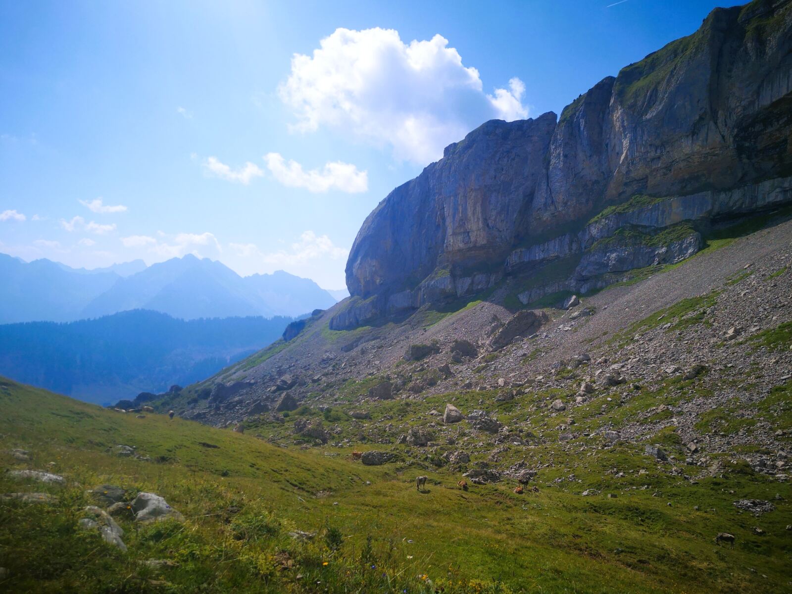 🗺️Ausgangspunkt unserer Tour ist Talstation der Ifenbahn. In den Gondeln gilt Maulkorbpflicht. Wir schweben hoch zur Mittelstation, die imposante Platte des Hohen Ifen im Blick. An der Mittelstation halten wir uns links. Wir folgen dem Wegweiser Richtung Hahnenköpfle. In Serpentinen bringt uns der breite Steig bergauf. Bald schon bietet sich ein wirklich beeindruckender Blick auf die massiven Ifen-Block. Darunter grasen Kühe, die sich zum Glück weitab vom Weg halten. Mit Hund ist uns das sehr recht.