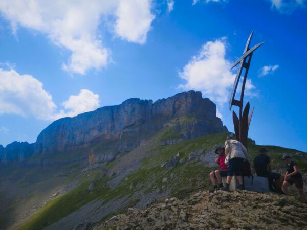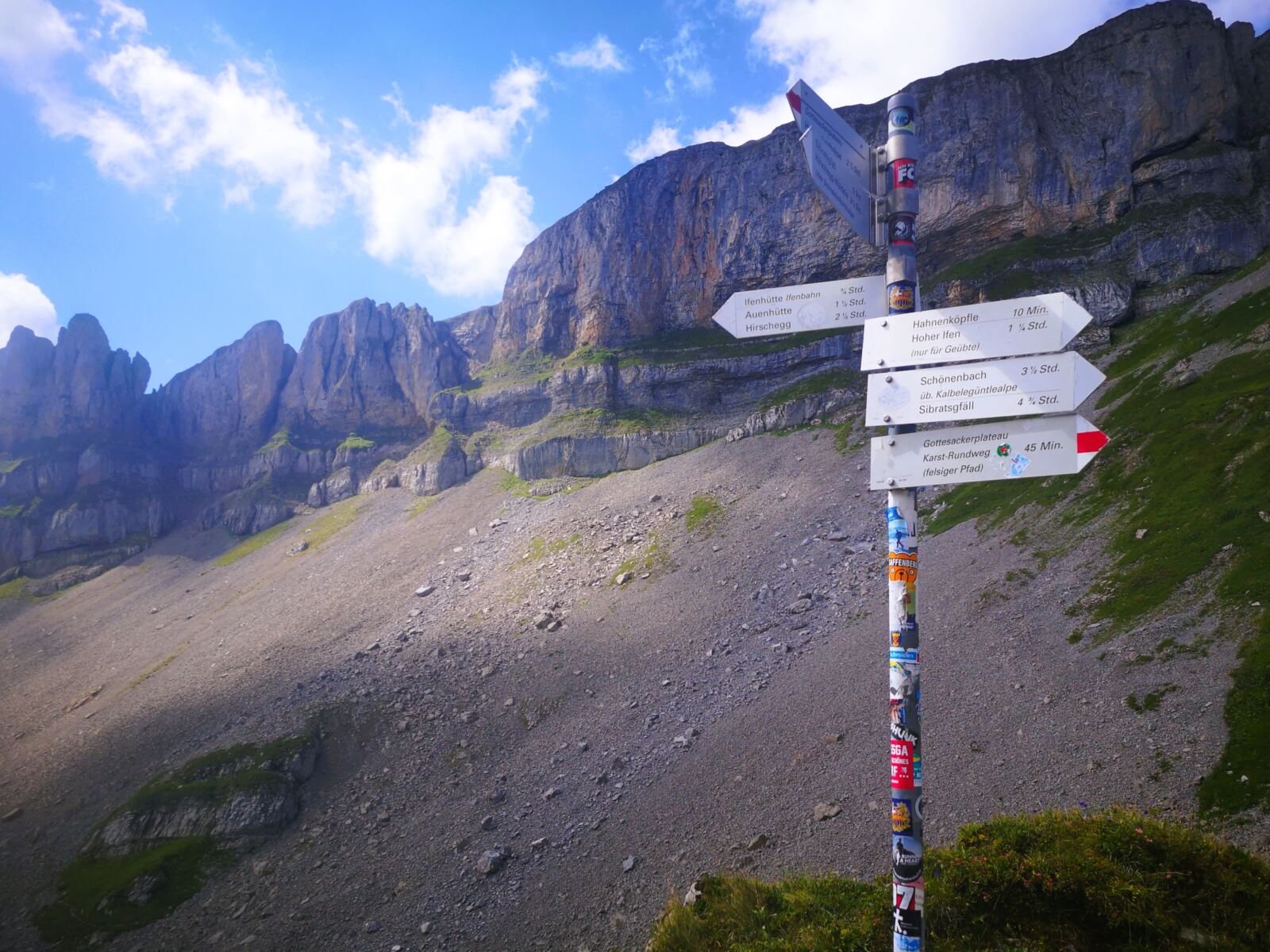 Nach einer ausgiebigen Rast folgen wir dem markierten Weg hinter dem Gipfelkreuz hinab, das Gipfelkreuz des Hohen Ifen im Rücken. Der markierte Pfad führt uns um weiten Bogen über das Gottesackerplateau. Gut zu wissen: Über die karstige Hochebene verläuft die Europäische Hauptwasserscheide – links in Richtung Rhein, rechts zur Donau.