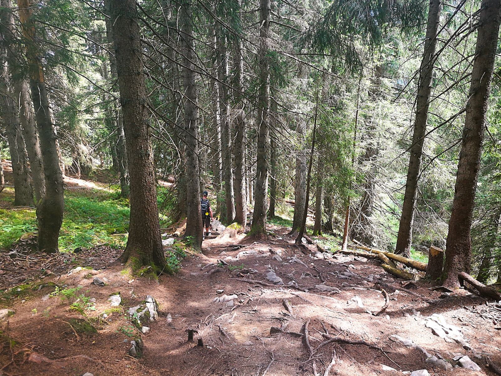 Dazu wählen wir den naturnahen Wanderweg 1 a, der rechts von der Mittelstation zunächst eben beginnt. Nach wenigen Schritten biegt er links vom Schotterpfad ab. In Serpentinen geht es auf einem abschnittsweise wurzelig-steinigen, aber insgesamt leicht zu meisternden Steig 300 Meter bergab ins Tal, meist im Waldschatten. Nach einer knappen Stunde erreichen wir die Talstation. Wer noch mal einkehren mag: Die Auenhütte an der Talstation sieht sehr einladend aus.