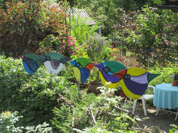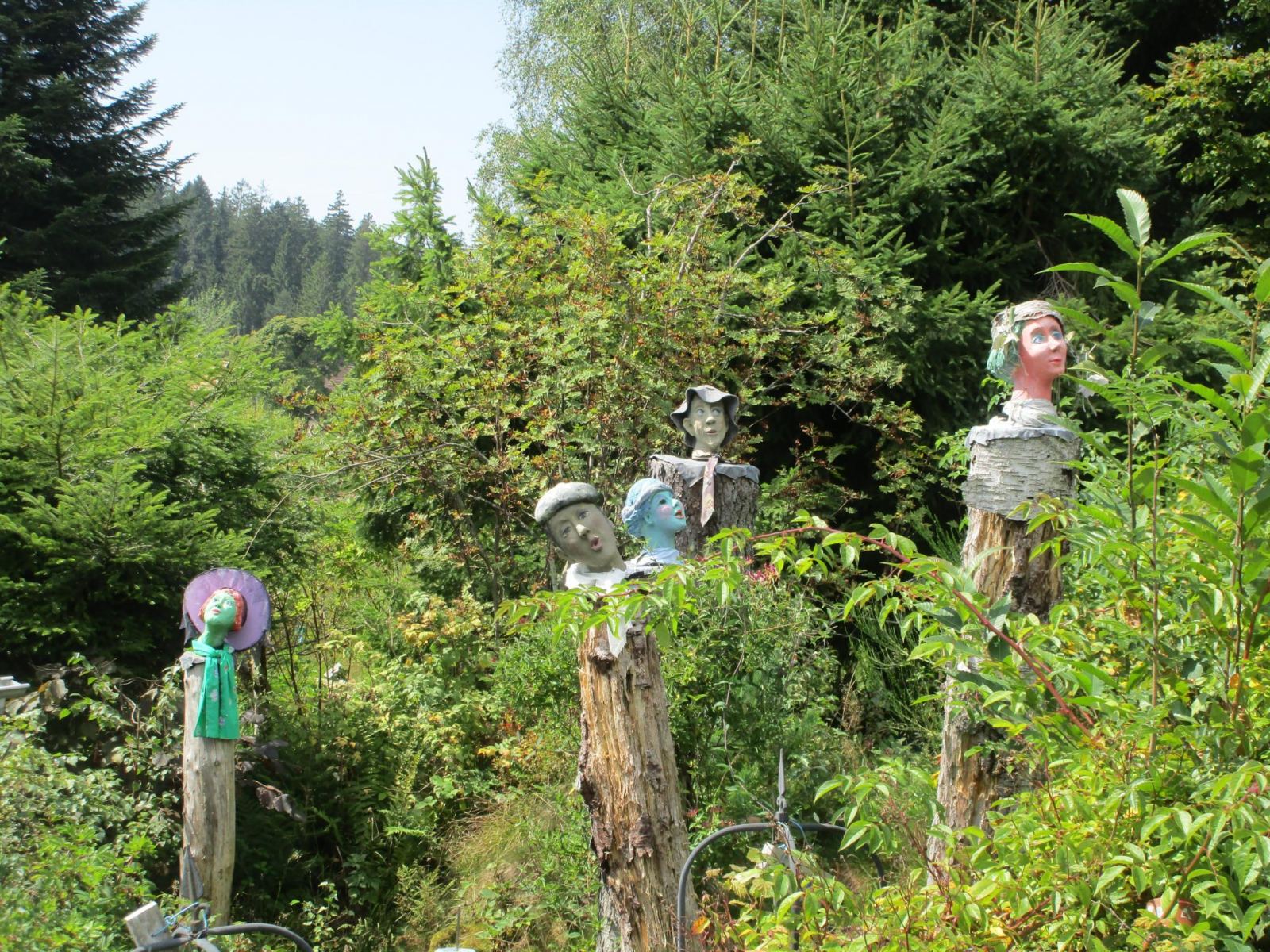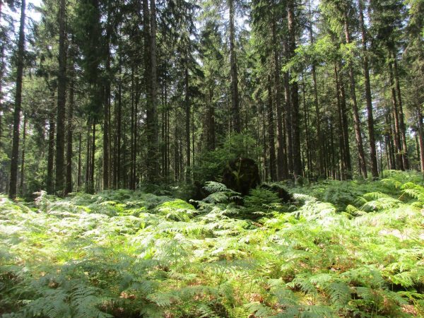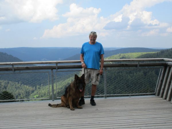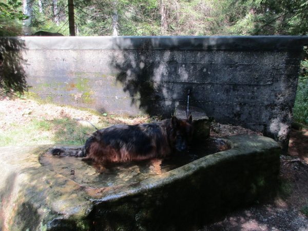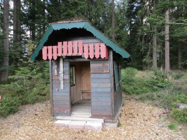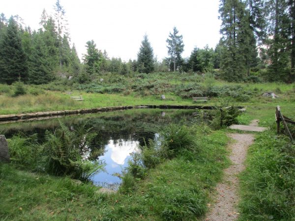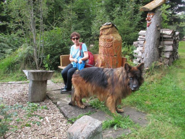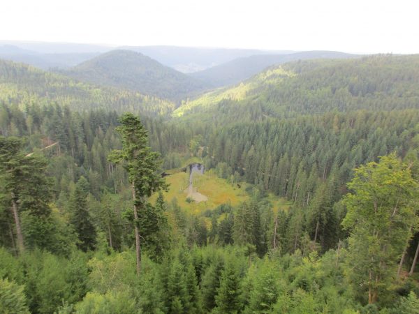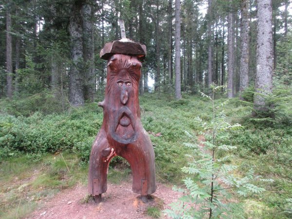 Nach einem Stück an dessen Rand entlang, geht es wieder in den Wald Richtung Ellbachseeblick zur Aussichtsplattform. Linkerhand zeigen sich Schliffkopf und Ruhestein, rechts grüßt der auf einem ehemaligen Munitionsdepot errichtete Windpark Simmersfeld mit seinen riesigen Windturbinen. Bei der Ellbachseeblickhütte geht es wieder nach links, ein wenig bergab bis zur Forbachquelle und dann auf dem Räuberpfad wieder ein wenig hoch. Wilde Figuren begleiten uns im Wald, Reh, Hase und Fuchs auch. Und immer wieder auch, wie eigentlich schon auf dem ganzen Heimatpfad, hölzerne Kunstwerke. Das Räuberwegle führt uns nun bis zum Skistadion, das wir passieren und bald schon am Ausgangspunkt unserer Wanderung zurück sind.