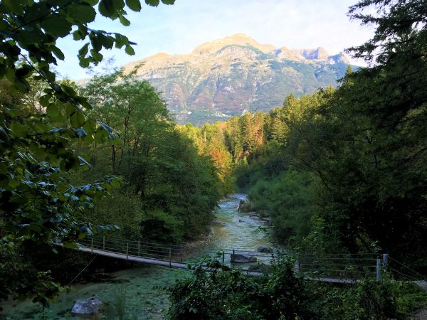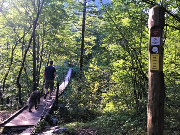 Diese Tour startet auf dem Campingplatz Camp Liza in der Nähe des kleinen Orts Bovec in Slowenien und führt uns durch lichten Wald über Hängebrücken über die Soca und durch den Weiler Jablenca. Ein Genuss für Hund und Mensch – wenn der Vierbeiner über schwankenden Untergrund läuft. Wunderschön auch an heißen Tagen.