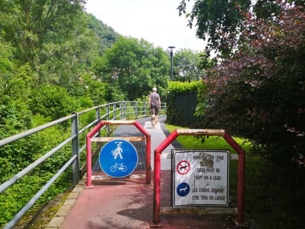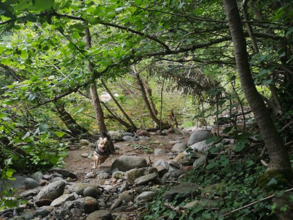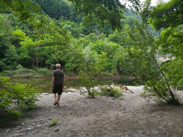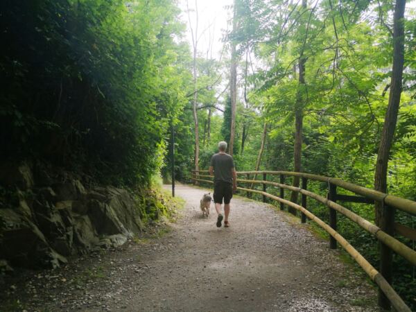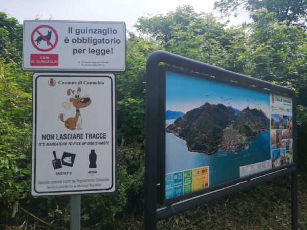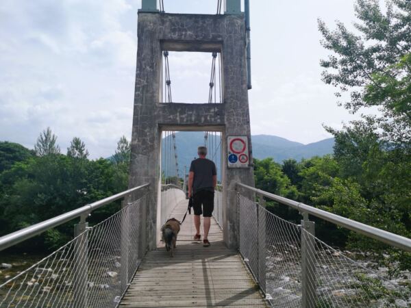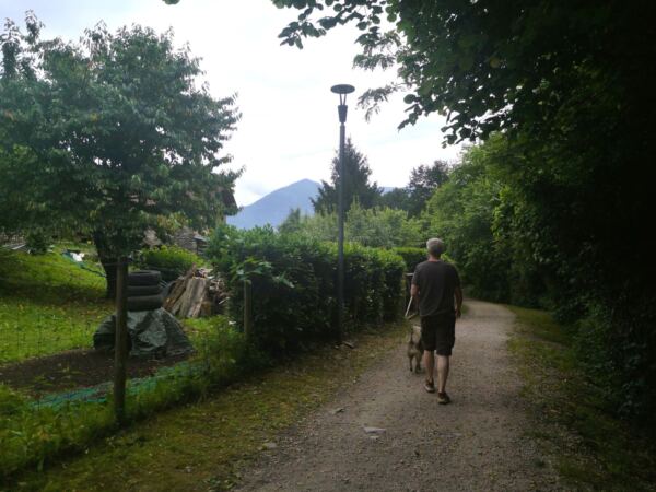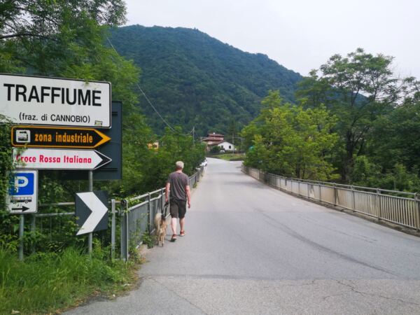 Ausgangspunkt unseres Spaziergangs ist der Campingplatz Valle Romantica, dessen Gelände einem liebevoll angelegten botanischen Garten gleicht. Die Rezeption im Rücken laufen wir wenige Schritte die Via Valle Cannobina bergab. Wir halten uns links und queren den Fluss über die Brücke. Hinter der Brücke biegt der Wanderweg direkt rechts ab. Schilder weisen uns daraufhin, dass wir unseren Hund an der Leine zu führen und seine Hinterlassenschaften zu beseitigen haben. Tütenspender stehen direkt daneben. Wir folgen dem befestigten Weg immer geradeaus. Er bringt uns schließlich – vorbei an einem Hundefreilaufplatz – zur Hängebrücke über den Cannobino am Ortseingang von Cannobio. Hinter der Brücke halten wir uns links und folgen den Fluss weiter bis zu seiner Mündung in den Lago Maggiore.