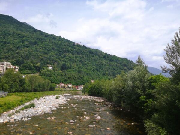 Wir folgen der Via A. Giovanola. An Hotel-Restaurants vorbei führt uns die Straße schließlich bergab. Wo sie auf die Kreuzung trifft, biegen wir scharf rechts ab. Über die Via S. Rocco laufen wir Richtung Fluss und vorbei am Wohnmobilstellplatz. Wir erreichen wieder die Hängebrücke. Nach der Brücke laufen wir dieses Mal links am Hundeplatz vorbei und weiter geradeaus. Durch die Büsche sehen wir den kleinen Spazierpfad. Diesem folgen wir durch das Wäldchen am Fluss geradeaus bis zur großen Sandbank unter der Brücke von Traffiume. Hier nehmen wir die Treppe hinauf zur Brücke, queren den Fluss und erreichen bald wieder unseren Campingplatz.