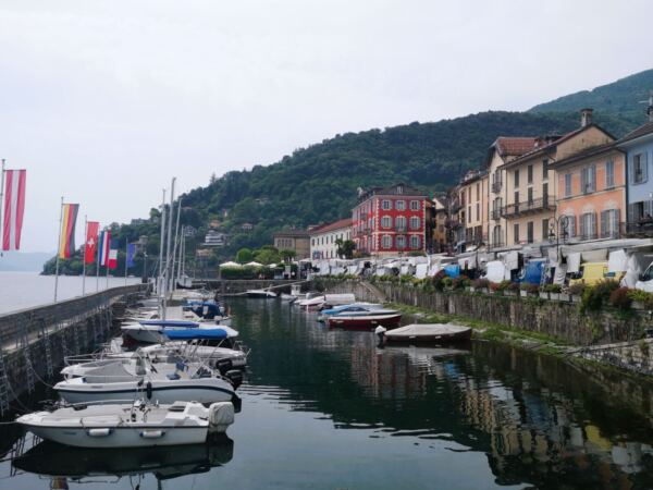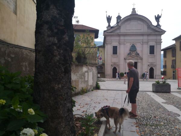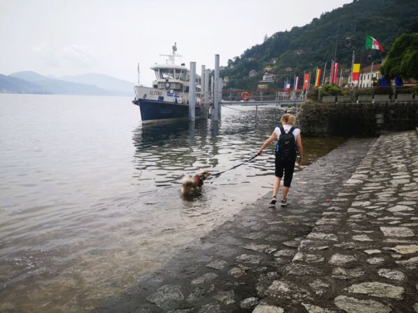 Es geht keine 3 km immer am Wasser entlang, meist im Baumschatten. Hin laufen wir auf dem offiziellen Wanderweg (Leinenpflicht), den wir uns mit Radlern teilen, zurück geht es auf dem schmalen, sandigen Spazierpfad entlang des Ufers. Dazwischen bummeln wir durch die autofreie Altstadt von Cannobio mit ihren bonbonbunten historischen Fassaden und dem sehr südländisch anmutenden Hafen. Mit Hund haben wir uns hier überall willkommen gefühlt.