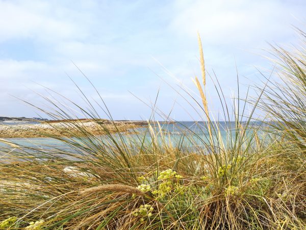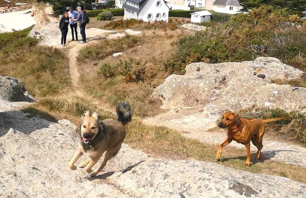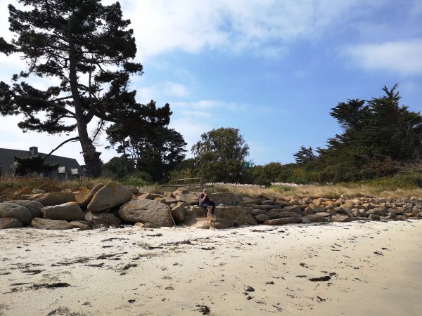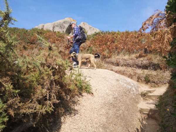 Diese Wanderung führt uns vom wunderbar gelegenen Campingplatz du Port in Landrellec immer an der Küste entlang bis zur fast schon mondänen Plage de Trégastel. Wir folgen dem bekannten Fernwanderweg GR 34, dem Zöllnerpfad. Es geht in vielen Windungen um zahlreiche Buchten, die mit ihren vielen, immer wieder anderen Felsformationen in allen Schattierungen zwischen Rosa und Braun viel Abwechslung bieten. Nur rund um das kleine Gebiet „Lande de Bringwiller“ gilt Leinenpflicht. Auf dem Rest der Strecke kann sich unser Amos wunderbar austoben.