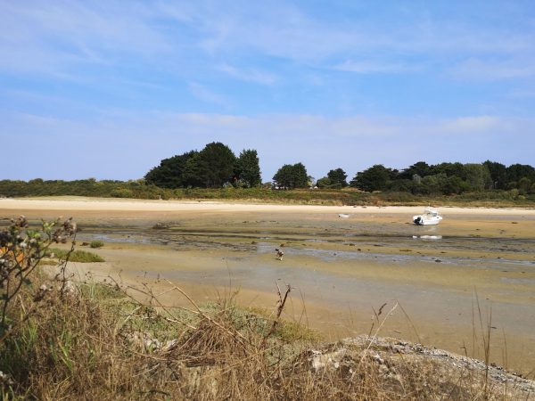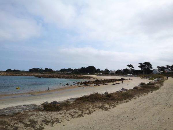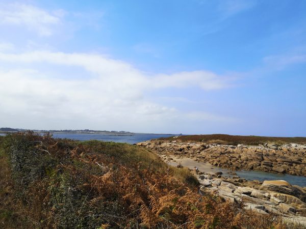 Gleich hinter dem Port und neben dem ersten der offiziellen Badestrände von Landrellec beginnt der Wanderweg.