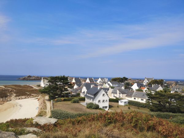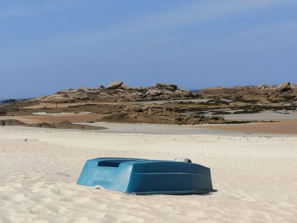 Der Campingplatz du Port liegt in Steinwurfweite vom GR 34. Nachdem wir die Einfahrt passiert haben, laufen wir am kleinen Strand entlang in Richtung des winzigen Fischerhafens. Dort beginnt der Zöllnerpfad, dem wir einfach bis zur Plage von Trégastel folgen. Nach einem Kaffee auf der Terrasse des Restaurants „La greve blanche“ geht`s auf demselben Weg zurück.