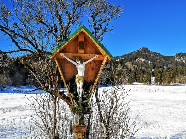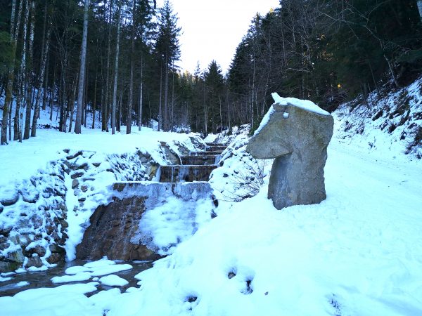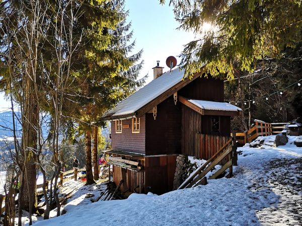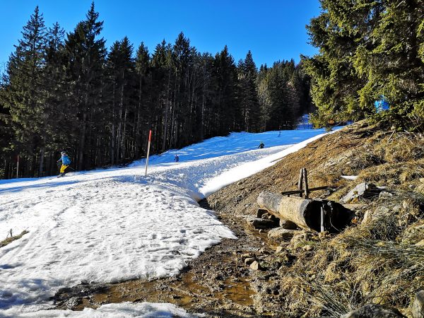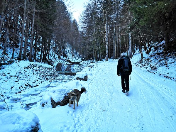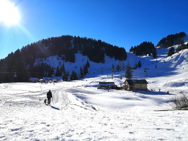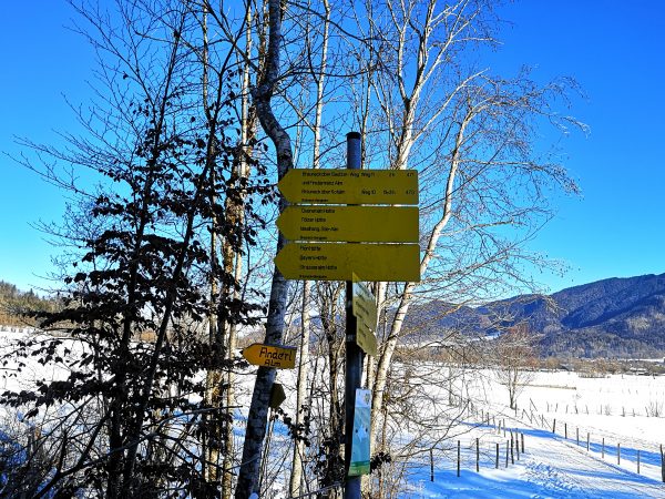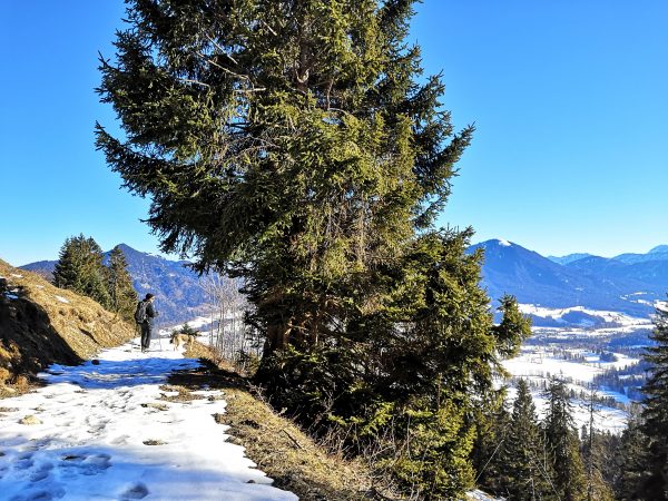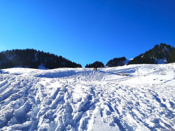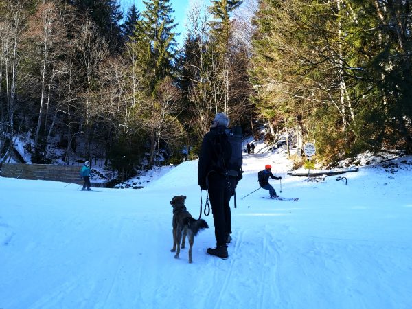 Stöcke und / oder Grödel mitnehmen. Denn der Wanderweg kann stellenweise sehr glatt sein, ebenso die gut präparierte Piste, die wir einmal auch an einem Steilstück kreuzen müssen.