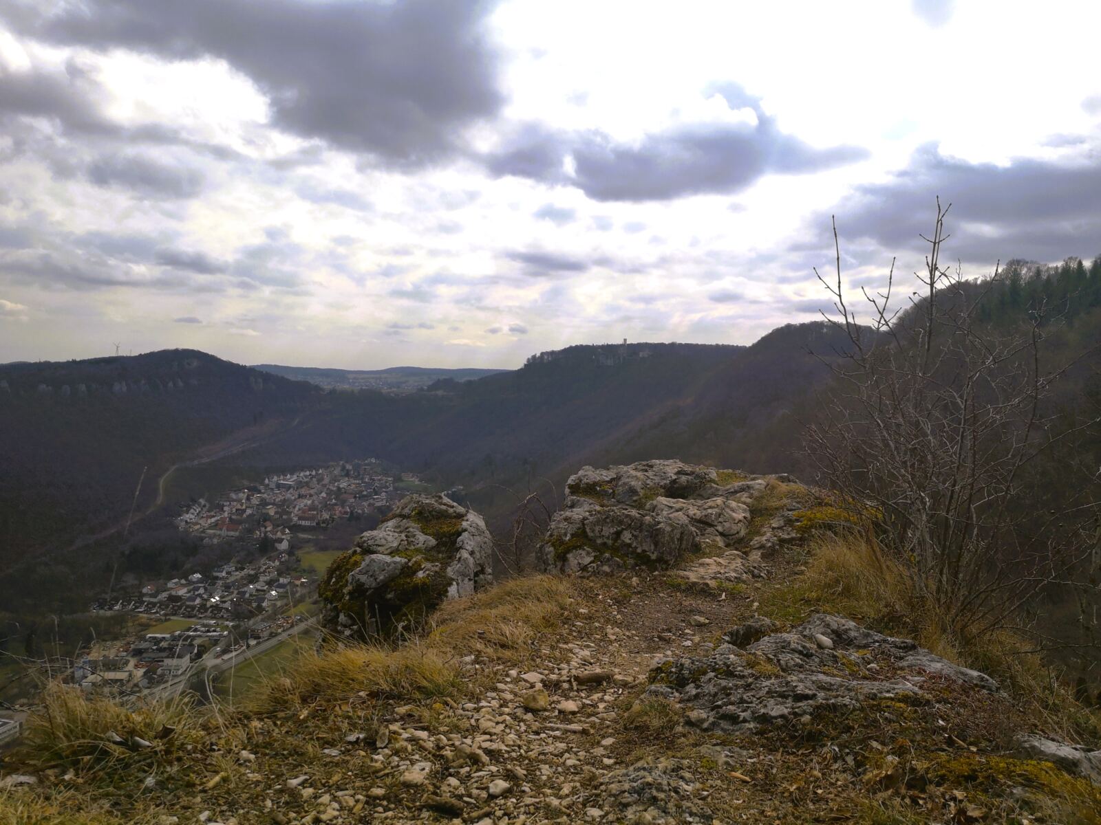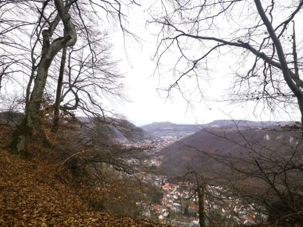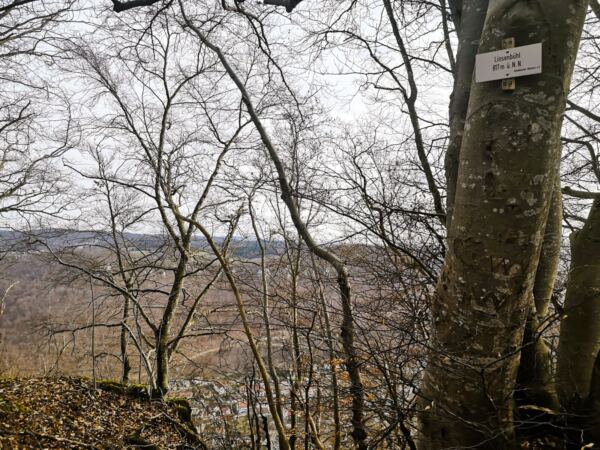 Der Weg knickt schließlich nach rechts ab und führt leicht bergauf zum Aussichtspunkt Brunnenstein. Von hier wandern wir weiter am Albtrauf entlang durch schönen Laubwald bis zum nächsten Aussichtsfelsen, dem Breitenstein. Hier öffnet sich großartiger Blick auf Schloss Lichtenstein und den im Tal liegenden Ortsteil Honau. Alzu übermütige Hunde sollte man an allen Aussichtspunkten dicht bei sich halten. Denn der Berg fällt überall steil ab.