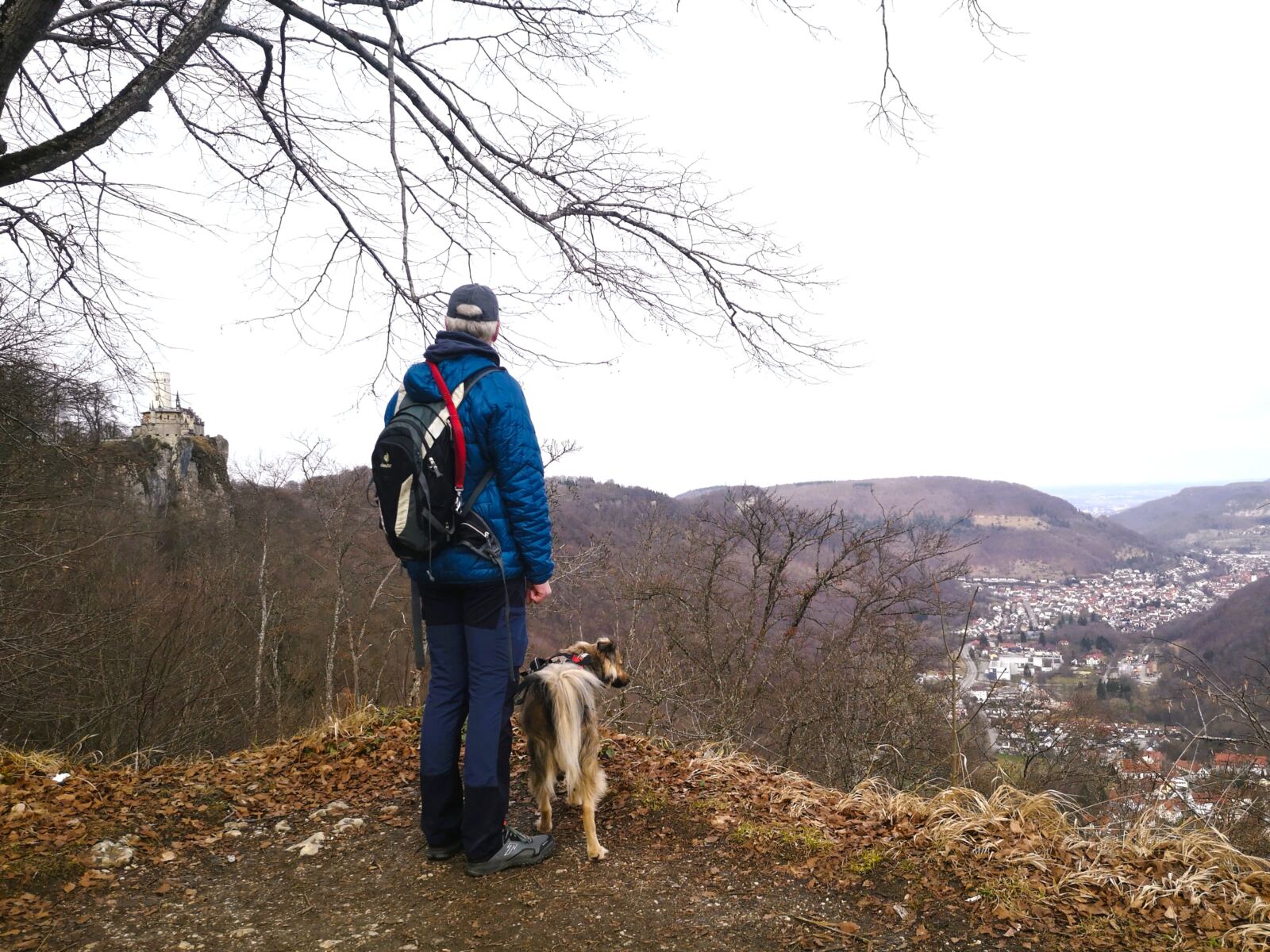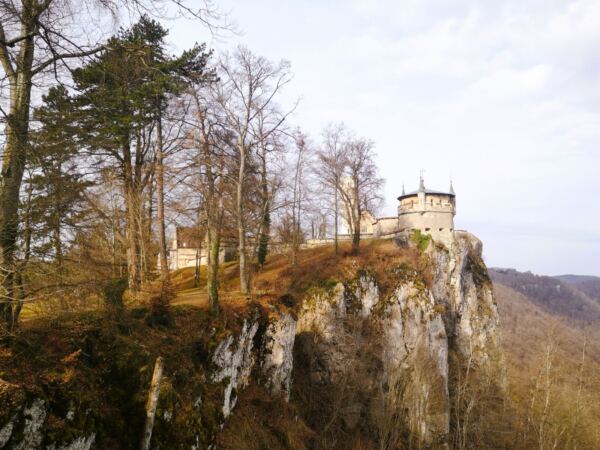Gleich zum Start erwartet uns der erste Höhepunkt: Hoch über dem Tal thront das Schloss Lichtenstein auf 817 Metern Höhe am Albtrauf. Die neugotische Anlage, inspiriert von Wilhelm Hauffs Roman Lichtenstein, wurde von 1840 bis 1842 erbaut und gilt bis heute als „Märchenschloss Württembergs“. Errichtet wurde sie auf den Grundmauern einer mittelalterlichen Ritterburg. Das Schloss befindet sich noch immer im Besitz der herzoglichen Familie von Urach. Von März bis Dezember kann man Schlosshof und ausgewählte Innenräume im Rahmen einer Führung besichtigen. Hunde dürfen an der Führung teilnehmen – sofern sie in den Innenräumen durchgängig auf dem Arm getragen werden. Unser Amos würde da leider streiken. 🙈 Mehr Infos zum Schloss und den Öffnungszeiten findet ihr hier.