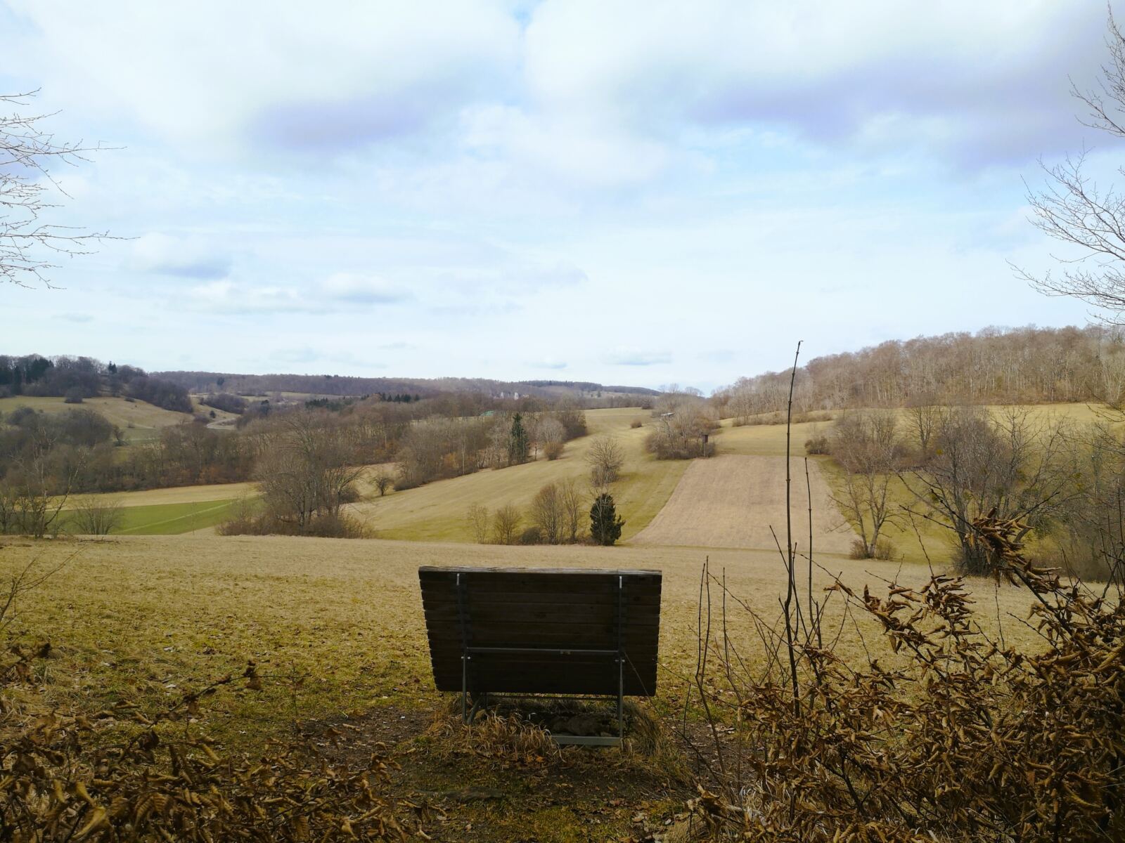 Der Weg führt anschließend ein kurzes Stück entlang der Straße, bevor wir diese überqueren und an der ersten Möglichkeit nach rechts abbiegen. Mit schönen Ausblicken auf die Gemeinde Sonnenbühl gelangen wir zu einer T-Kreuzung und biegen dort links ab.