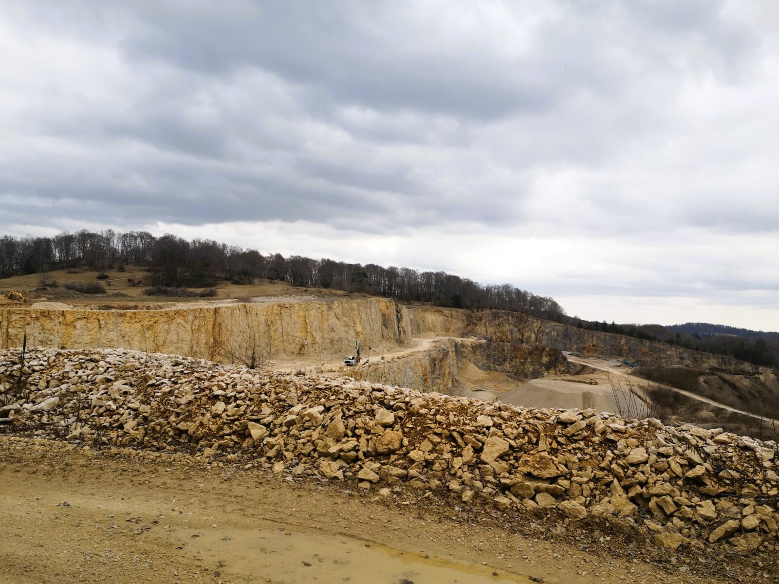 Nach einem kurzen Anstieg bringt uns die Beschilderung zurück auf den Pfad entlang des Steinbruchs. Wir passieren ein kleines Waldstück auf der rechten Seite, biegen anschließend links ab und halten uns nach einem sanften Anstieg rechts.