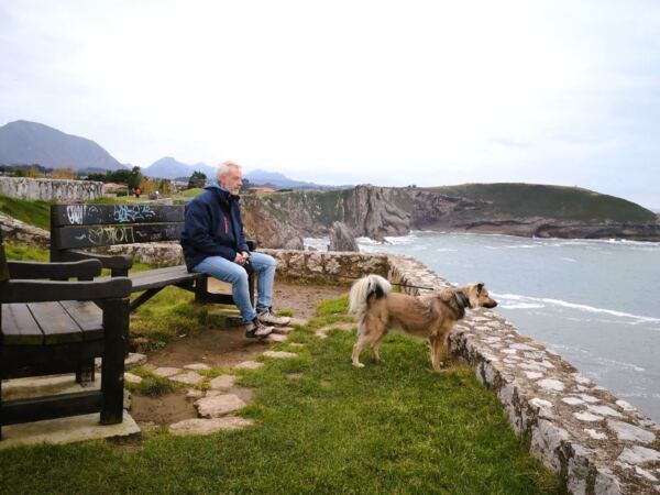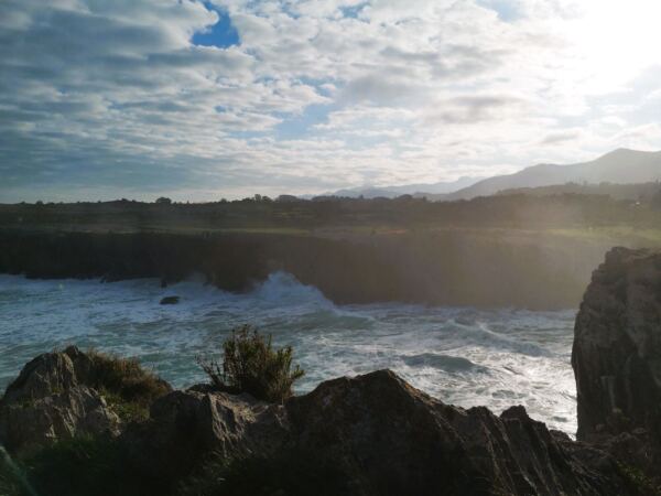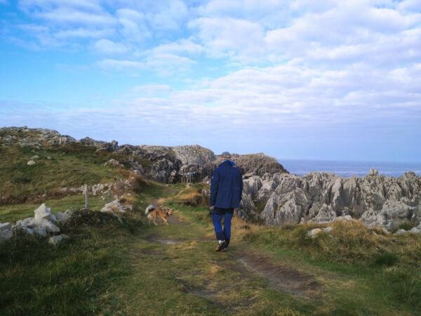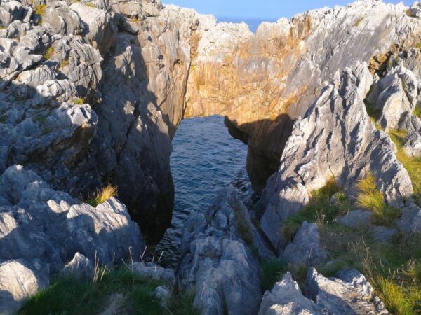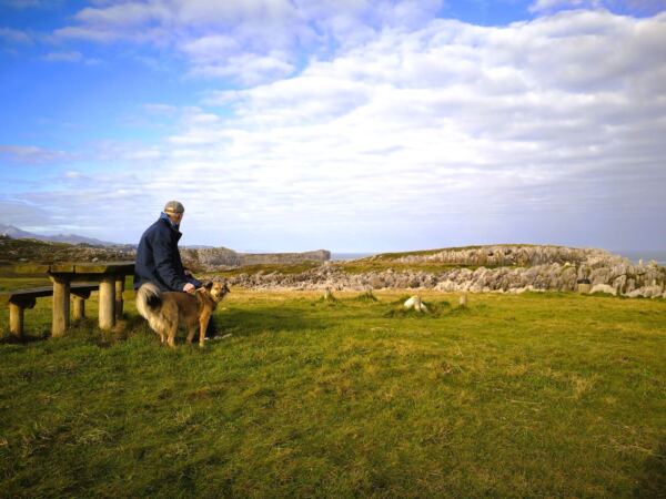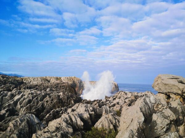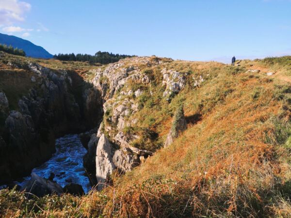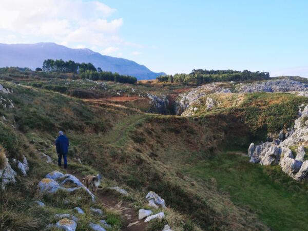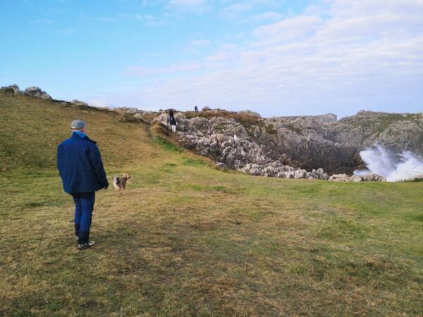 Das Wasser steht niedrig. Ohne Schuhe und Strümpfe auszuziehen, können wir die Bucht durchqueren. Über eine Holztreppe kommen wir den Hang hinauf und gelangen auf den Camino los Acantilados del Castruarenes. Wir folgen dem Teersträßchen bis zu ihrem Ende. Hier startet der Küstenpfad Camino los Castros. Ein großer Rastplatz mit Bänken zeugt davon, dass Menschen hier gerne den Blick genießen. Kein Wunder. Rechts von uns, auf der anderen Seite der Bucht, liegen die gewaltigsten Bufones. Obwohl wir im Winter hier sind, ist das Meer eher zahm, die Fontänen steigen nicht hoch. Trotzdem ein großartiger Anblick. Wir halten uns links und folgen dem Wanderpfad am Meer über felsdurchsetze Wiesen. Wunderschön. Immer wieder tun sich Löcher im Boden auf, in denen es gurgelt. Unser Amos findet es ebenso spannend wie wir, auf die Fontänen zu warten, die plötzlich daraus hervorschießen. Wir folgen dem Wanderpfad immer weiter geradeaus durch diese fast mystisch anmutende, entrückte Welt. Hier und da laufen wir über schmale natürliche Felsbrücken, links und rechts von uns breite und tiefe Löcher, in denen das Meer brandet. Besonders schön: die Brücke am Pozu Tuerba.