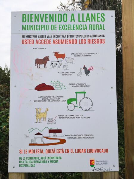 So sympathisch kann man auf die Besonderheiten des Landlebens hinweisen. :-) Llames bittet darum, Hunde an die Leine zu nehmen, wenn wir uns den Pfad mit freilaufenden Kühen, Ziegen oder Schafen teilen. Die sind uns ebenso wenig begegnet wie die Herdenschutzhunde. Wir waren hier allerdings auch im Winter unterwegs.