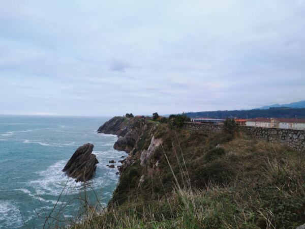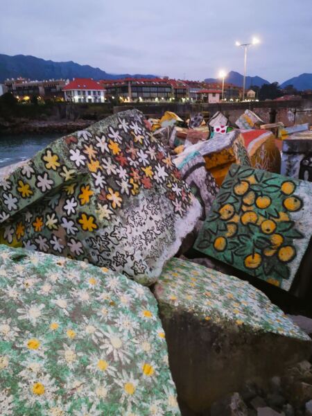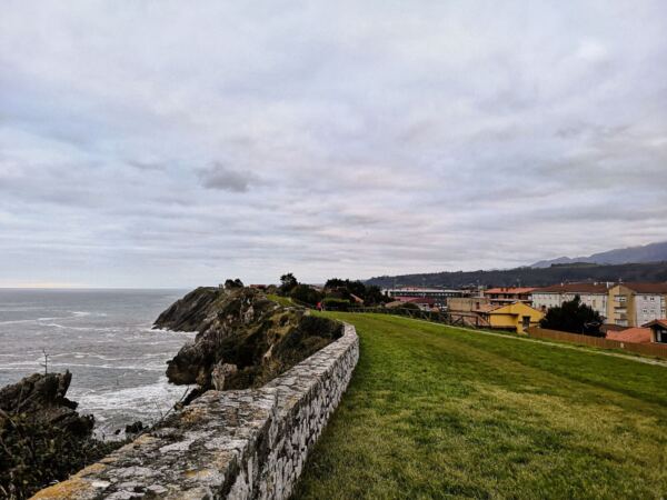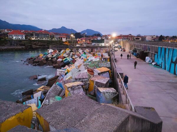 Über die C. Vicente Pedregal Galguera laufen wir bergauf Richtung Grün und Meer. Wir steigen erst einmal hinauf auf den Aussichtspunkt Mirador La Talá. Der Blick über die Steilküste und den Paseo ist großartig. Jetzt geht es immer geradeaus über die Steilküste Weg mit durchweg schönen Aussichten. Zwischendurch laden Bänke zur Rast ein. Schließlich erreichen wir die Playa de El Sablón, eine halbkreisförmige Bucht mit feinem Sand. Wir steigen ab zum Meer, durchqueren die Bucht. Am blauen Restaurant-vorbei erreichen wir die Hafenmole. Wir spazieren bis zu ihrem Ende und steigen in den Hafen hinab. Hier liegen auch die Los Cubos de la Memoria (Würfel der Erinnerung), bunte Betonblöcke, bemalt von Agustín Ibarrola.