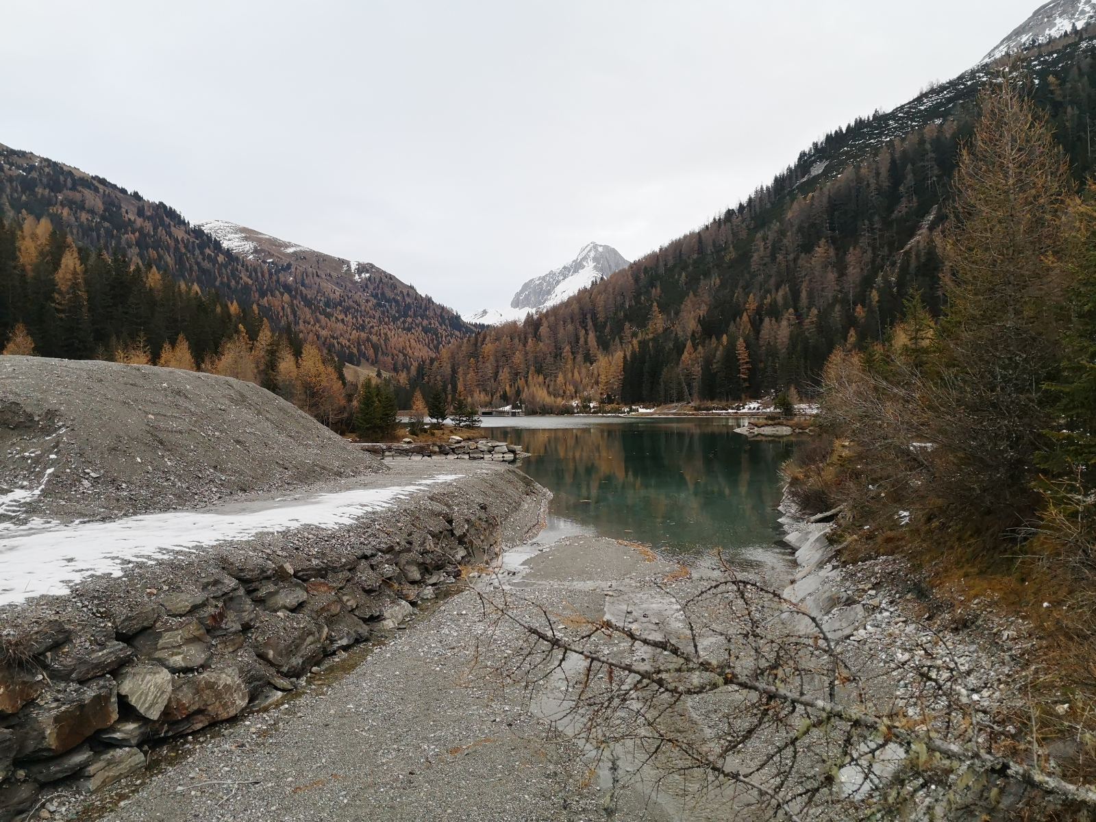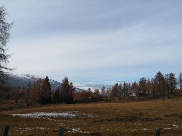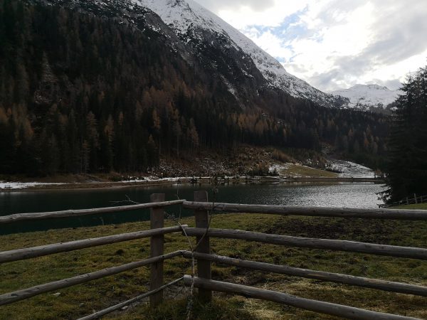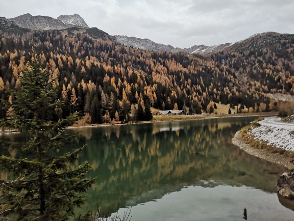 Dann erreichen wir den Parkplatz des Schlierersees und wenige Meter weiter den Schlierersee. Direkt am Ufer liegt die Schliereralm, die im November leider nicht bewirtschaftet ist. Macht nichts: Stattdessen trinken wir unser mitgebrachtes Radler am Ufer des glasklaren Bergsees.