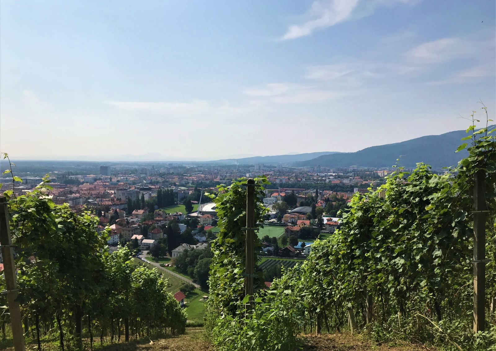 Blick vom Wein-bestandenen Kalvarienberg auf Maribor.