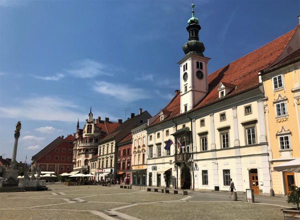 Maribors Hauptplatz, der Glavni trg mit dem Rathaus Rotovz und der Pestsäule.