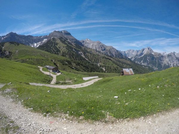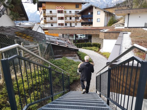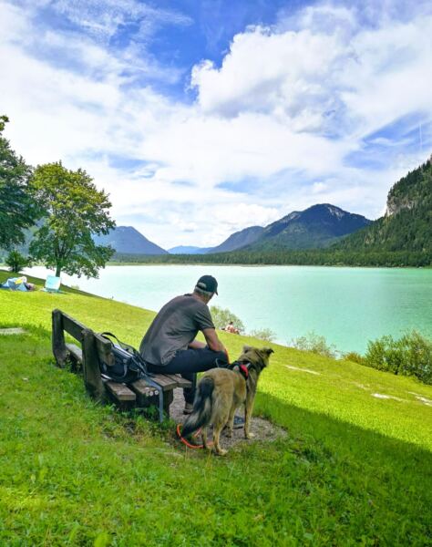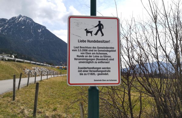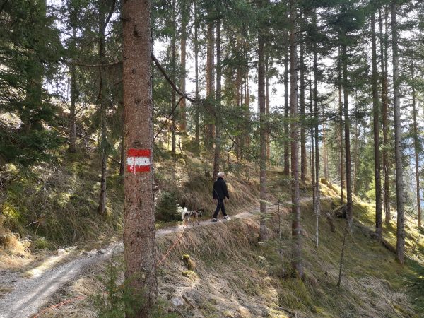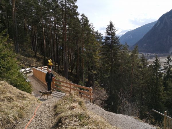 Ausgangspunkt unserer Tour ist das Wassersportzentrum Atoll in Maurach. Auf dem großen Parkplatz lässt sich auch ein Wohnmobil problemlos abstellen. Wir queren die Hauptstraße, halten uns links und laufen am See nach Buchau. Hinter dem Kinderhotel Buchauch zweigt rechts eine zunächst geteerte Fahrstraße ab. Wir folgen ihr und dem Wegweiser „Dalfazer Wasserfall“ den Berg hinauf. Bald geht die Teerstraße in den Forstweg über. Und wenig später bietet sich rechterhand die erste Möglichkeit, den Forstweg über einen Steig abzukürzen. Der Steig kreuzt immer wieder den Forstweg. Schließlich führt er uns von oben an die Aussichtsplattform vor dem Wasserfall heran. Die ist bereits voll besetzt. Macht nix. Wir laufen zum Wasserfall hinunter und suchen uns ein schönes Plätzchen außerhalb der eiskalten Gischt mit Blick auf den See. Danach verlassen wir den Wasserfall über die Forststraße. An der nächsten großen Kreuzung laufen wir wenige Schritte bergauf und biegen dann rechts ab in den Wald. Der schmale Wurzelpfad, der mit dem Wandersymbol rot-weiß-rot gekennzeichnet ist, bringt uns mit Seeblick hinab zum Buchauer Wasserfall. Wir überqueren die Holzbrücke, laufen weiter geradeaus, biegen an der nächsten Gabelung rechts ab Richtung Buchau. Auf den letzten Metern vor dem Ort müssen wir noch eine Gittertreppe überwinden (Amos wird getragen, vorbeilaufen ginge zur Not auch). Vor dem Kinderhotel treffen wir wieder auf die bekannte Buchauer Straße. Ab hier geht es an der Straße wieder zurück zum Atoll.