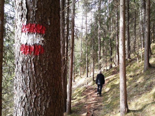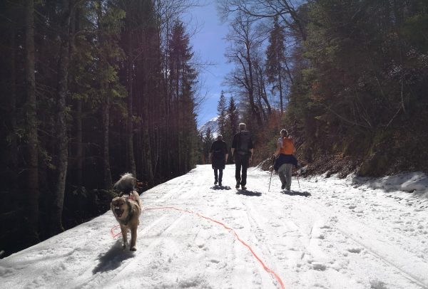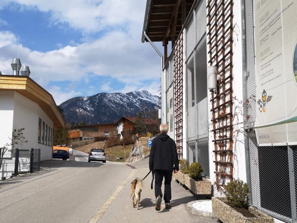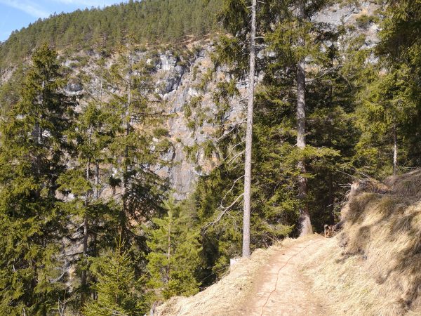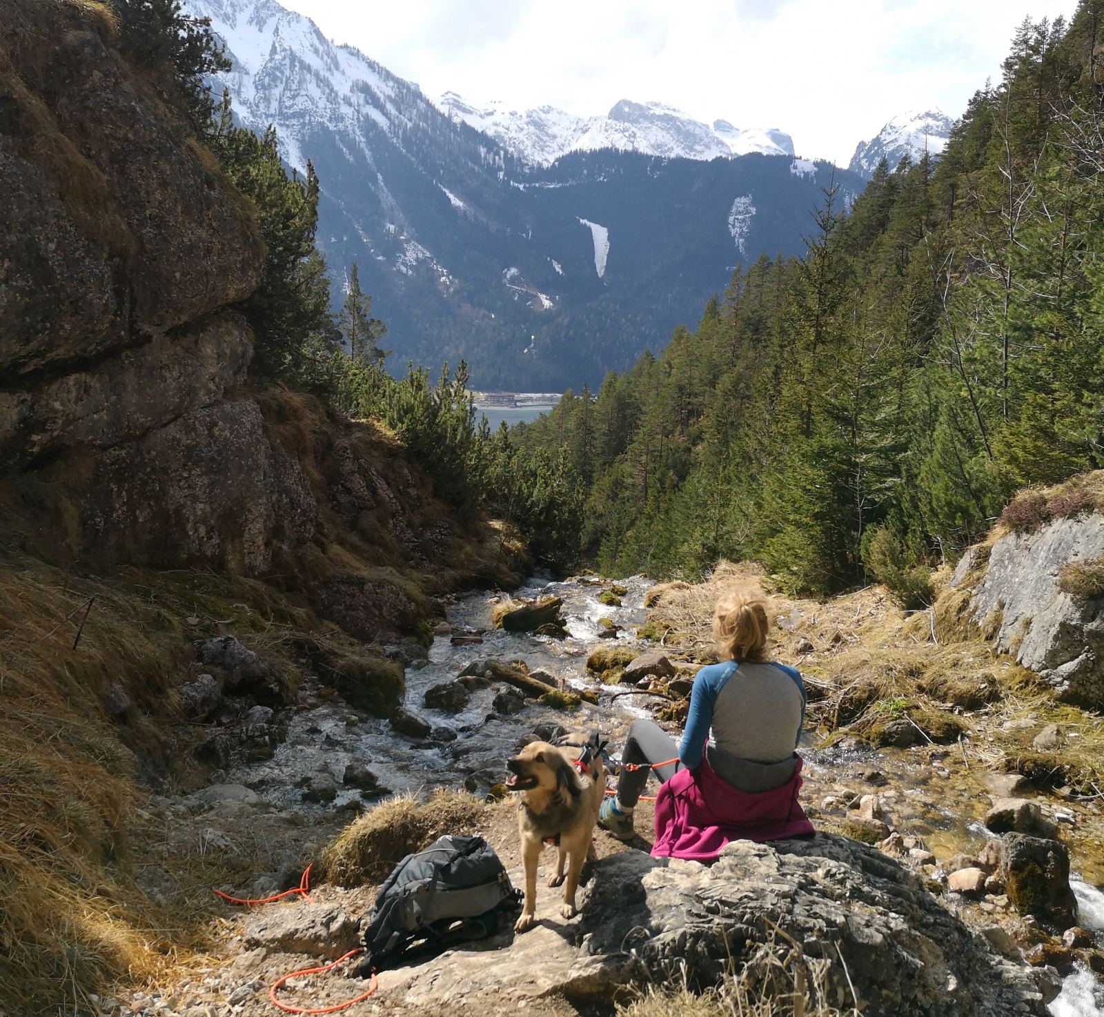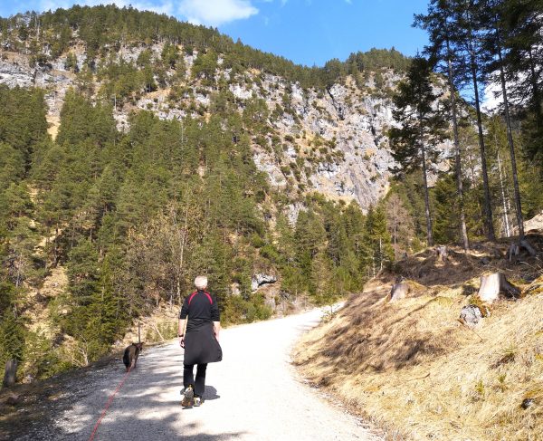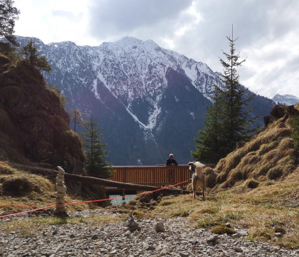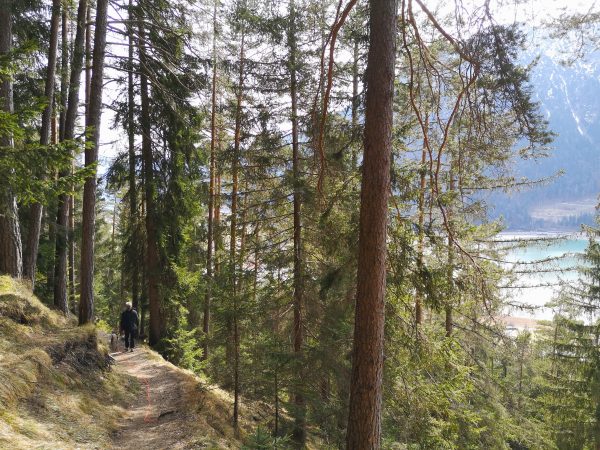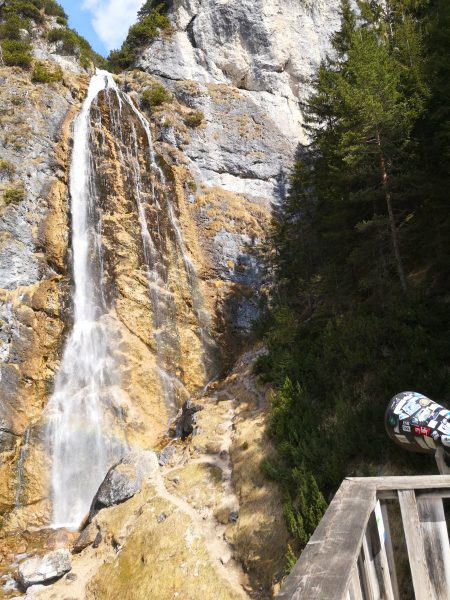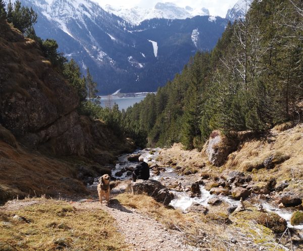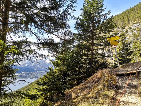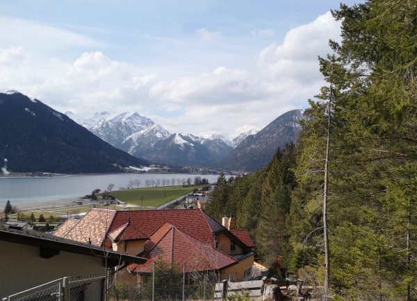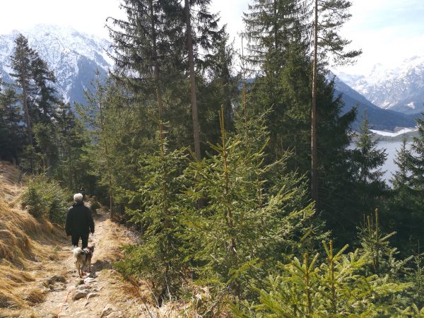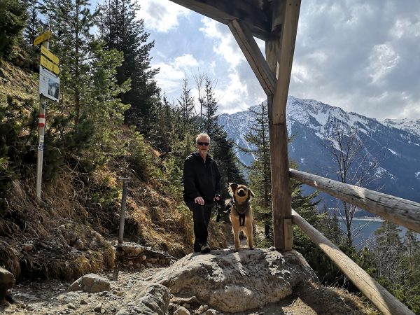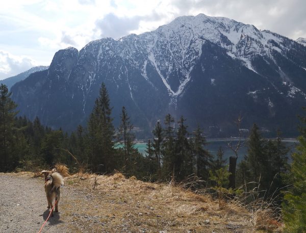 Mit seinen gut 60 m Fallhöhe ist der Dalfazer Wasserfall der höchste im Rofangebirge. Ein Touristenmagnet, der auch bei Restschnee über eine breite Forststraße leicht zu erreichen ist. Wir sind im schönsten Sonnenschein, der den Schnee weggeleckt hat, mit unserem Amos unterwegs und können die Forststraße über den Bergsteig abkürzen. Oben erwartet uns ein wunderschöner Blick auf den türkisblauen Achensee, darüber der Wasserfall, der imposant tosend nach unten stürzt. An diesem sonnigen Sonntag sind wir hier oben nicht allein. Aber so viel Schönheit lässt sich gut teilen. Durch lichten Wald geht`s dann über Wurzelpfade wieder hinab zum – trockenen – Buchauer Wasserfall, den See immer im Blick. Dieser zweite Teil der Runde ist mindestens ebenso schön wie der Aufstieg, doch hier sind wir fast alleine unterwegs.