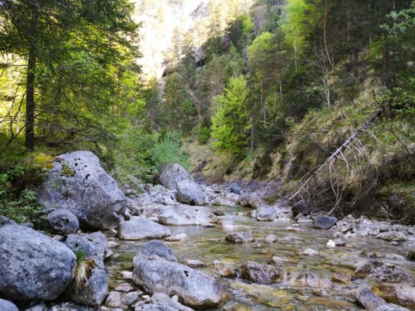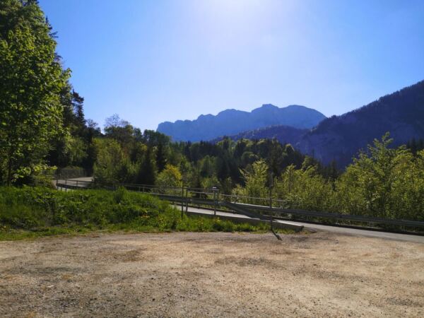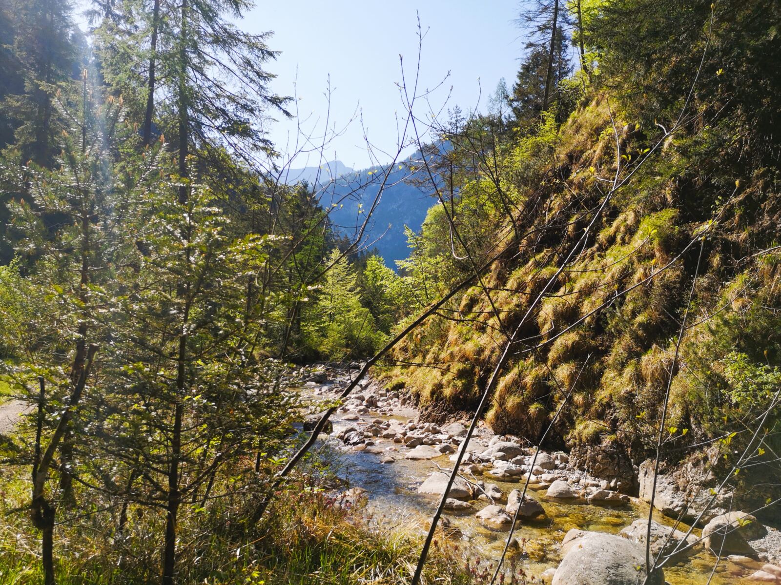 Der Startpunkt unserer Wanderung liegt auf bayerischer Seite, am kleinen Wanderparkplatz direkt hinter dem Weiler Melleck (Gemeinde Schneizlreuth) am Steinpass. Gleich hinter der Brücke über den rauschenden Steinbach, der hier die Grenze zu Österreich markiert, starten wir. Rechts von uns strudelt das kristallklare Wasser über Felsbrocken – ein schöner Auftakt!