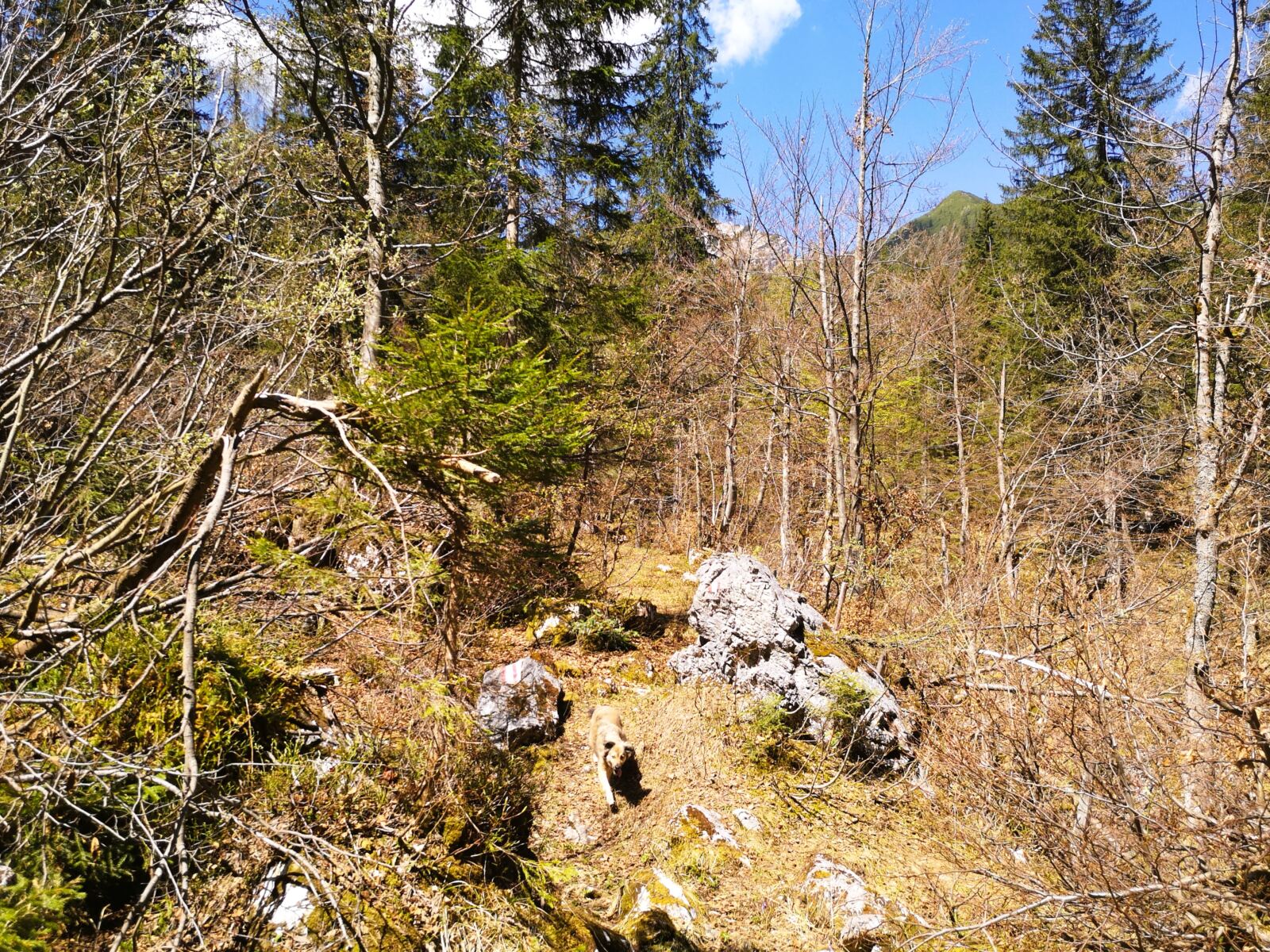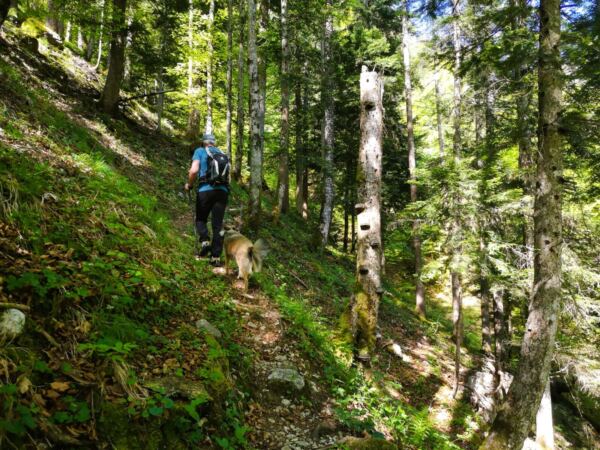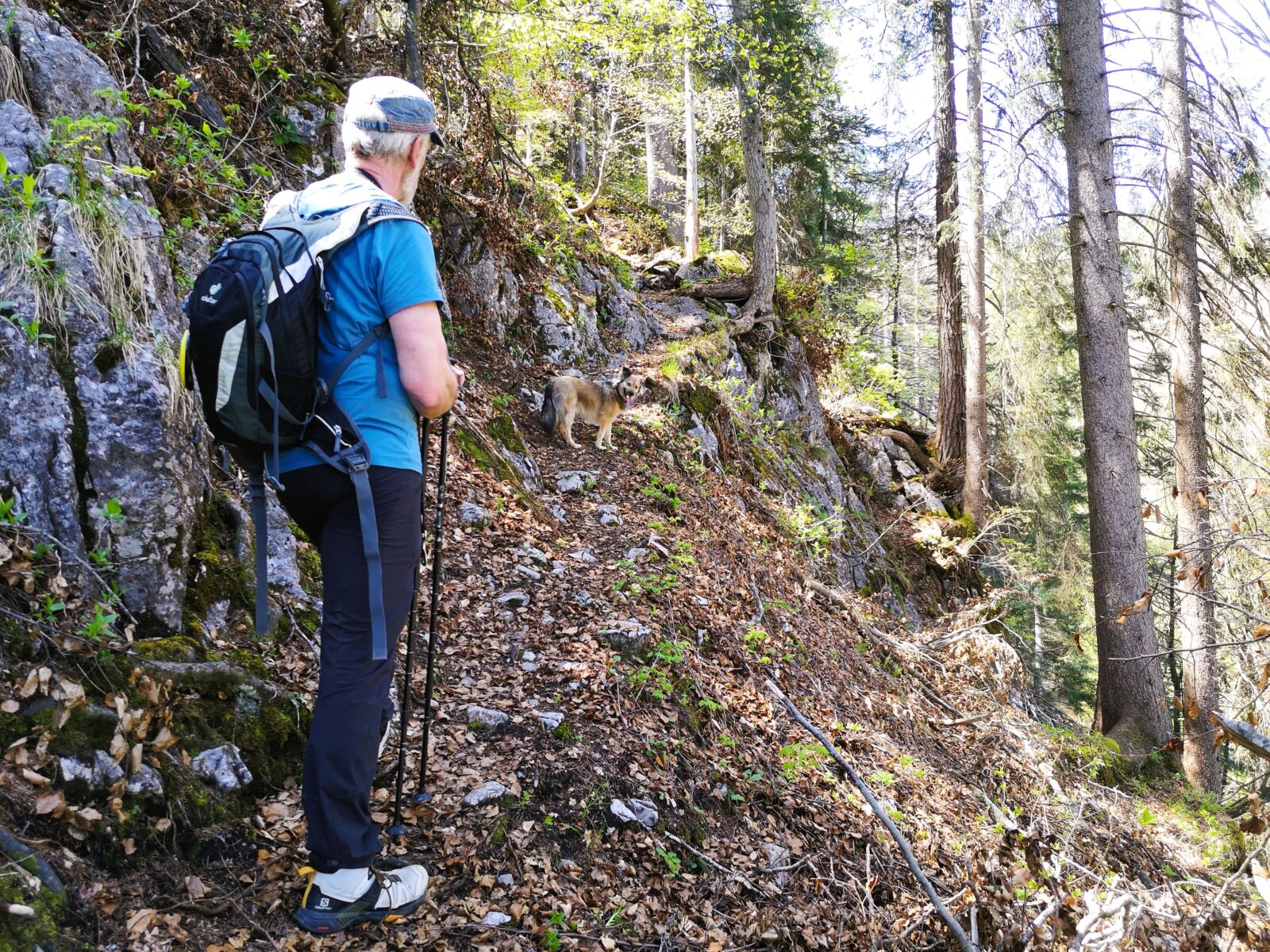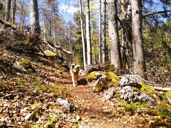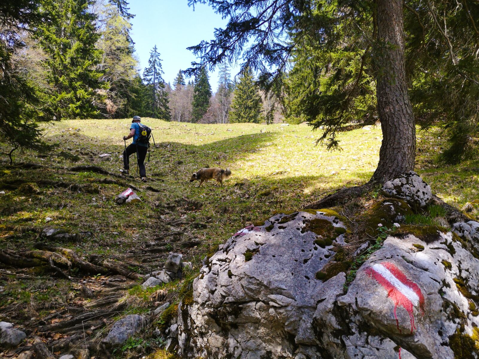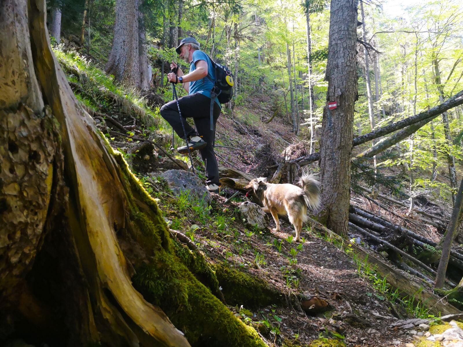 Der Weg ist durchgehend gut beschildert bzw. rot-weiß-rot markiert. Unter Füßen und Pfoten: überwiegend schmale Steige, die auf dem letzten Viertel steinig sind. Auf dem Roßkarsteig helfen Stöcke beim steilen Auf und Ab. Gut drei Viertel des Wegs wandern wir durch lichten Mischwald, den Rest schattenlos mit Weitblick. Technisch stellt der Weg keine Herausforderungen an Menschen und Hunde. Er verlangt jedoch Trittsicherheit und eine gute Kondition. Immerhin legen wir beim Aufstieg rund 1.400 Höhenmeter zurück.  Zwar treffen wir entlang des Wegs immer wieder auf Bäche. Trotzdem solltet ihr an warmen Tagen auch für den Hund ausreichend Wasser mitnehmen. Der Roßkarsteig ist bei Schnee absolut ungeeignet. Auch nicht zu empfehlen, wenn’s sehr nass ist. Dann könnte es hier für Zweibeiner viel zu rutschig werden.