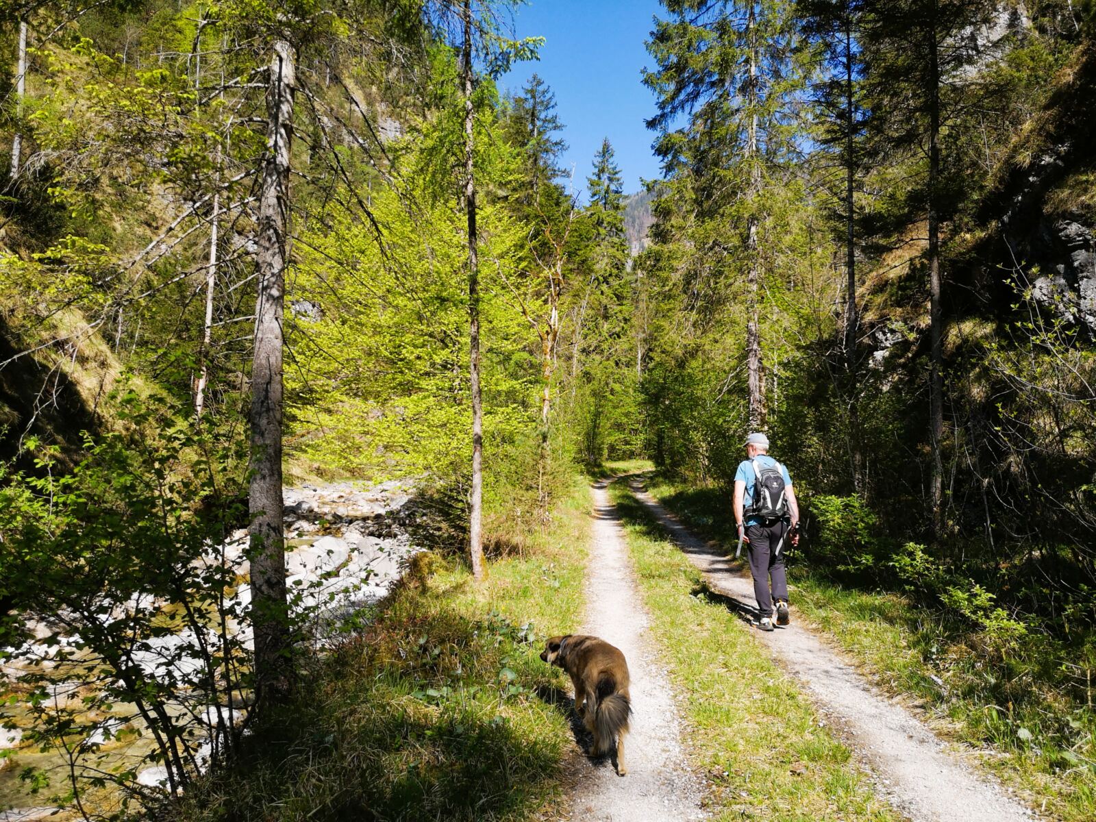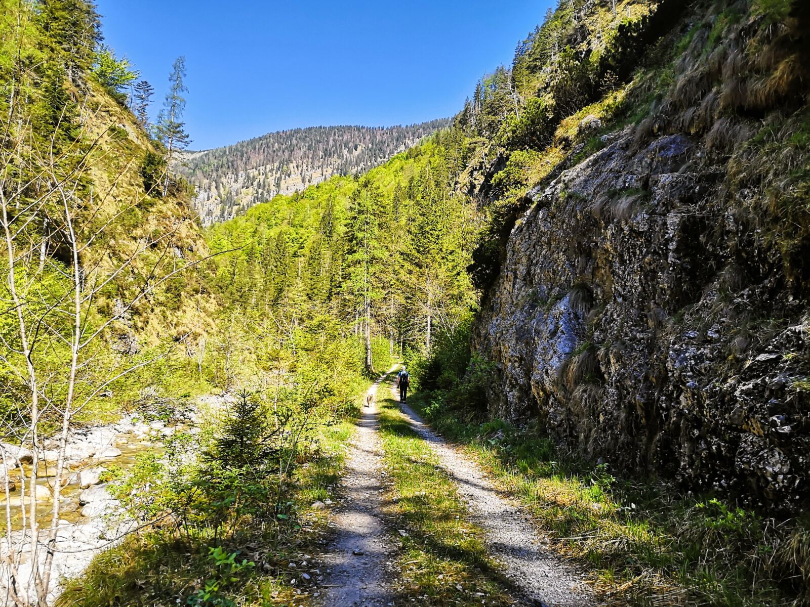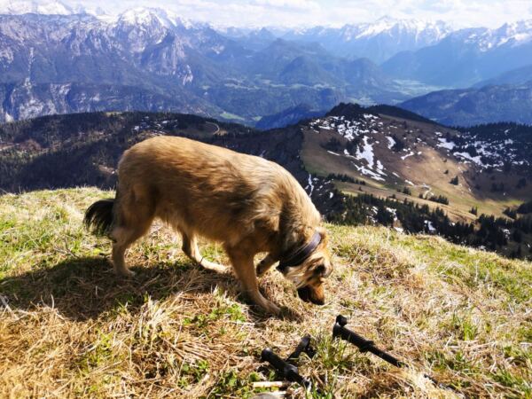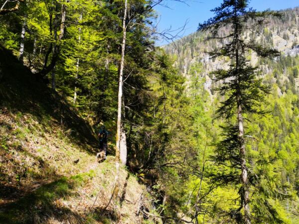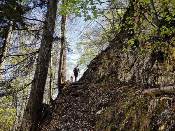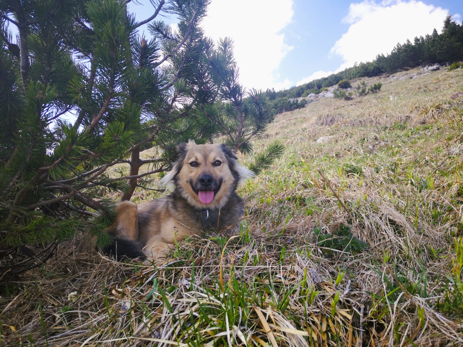 Der Weg ist durchgehend gut beschildert bzw. rot-weiß-rot markiert. Unter Füßen und Pfoten: überwiegend schmale Steige, die auf dem letzten Viertel steinig sind. Auf dem Roßkarsteig helfen Stöcke beim steilen Auf und Ab. Gut drei Viertel des Wegs wandern wir durch lichten Mischwald, den Rest schattenlos mit Weitblick. Technisch stellt der Weg keine Herausforderungen an Menschen und Hunde. Er verlangt jedoch Trittsicherheit und eine gute Kondition. Immerhin legen wir beim Aufstieg rund 1.400 Höhenmeter zurück.  Zwar treffen wir entlang des Wegs immer wieder auf Bäche. Trotzdem solltet ihr an warmen Tagen auch für den Hund ausreichend Wasser mitnehmen. Der Roßkarsteig ist bei Schnee absolut ungeeignet. Auch nicht zu empfehlen, wenn’s sehr nass ist. Dann könnte es hier für Zweibeiner viel zu rutschig werden.