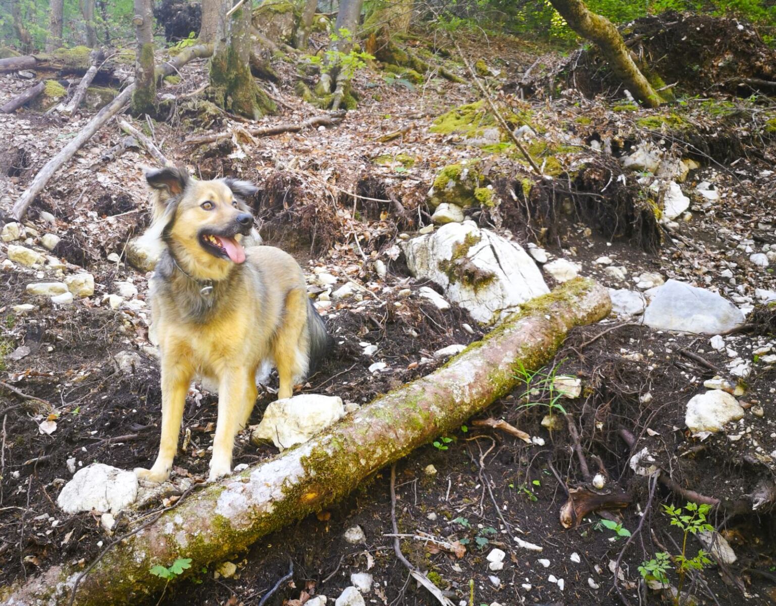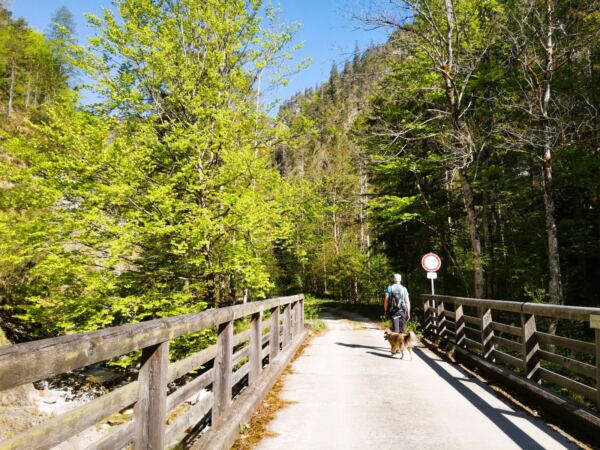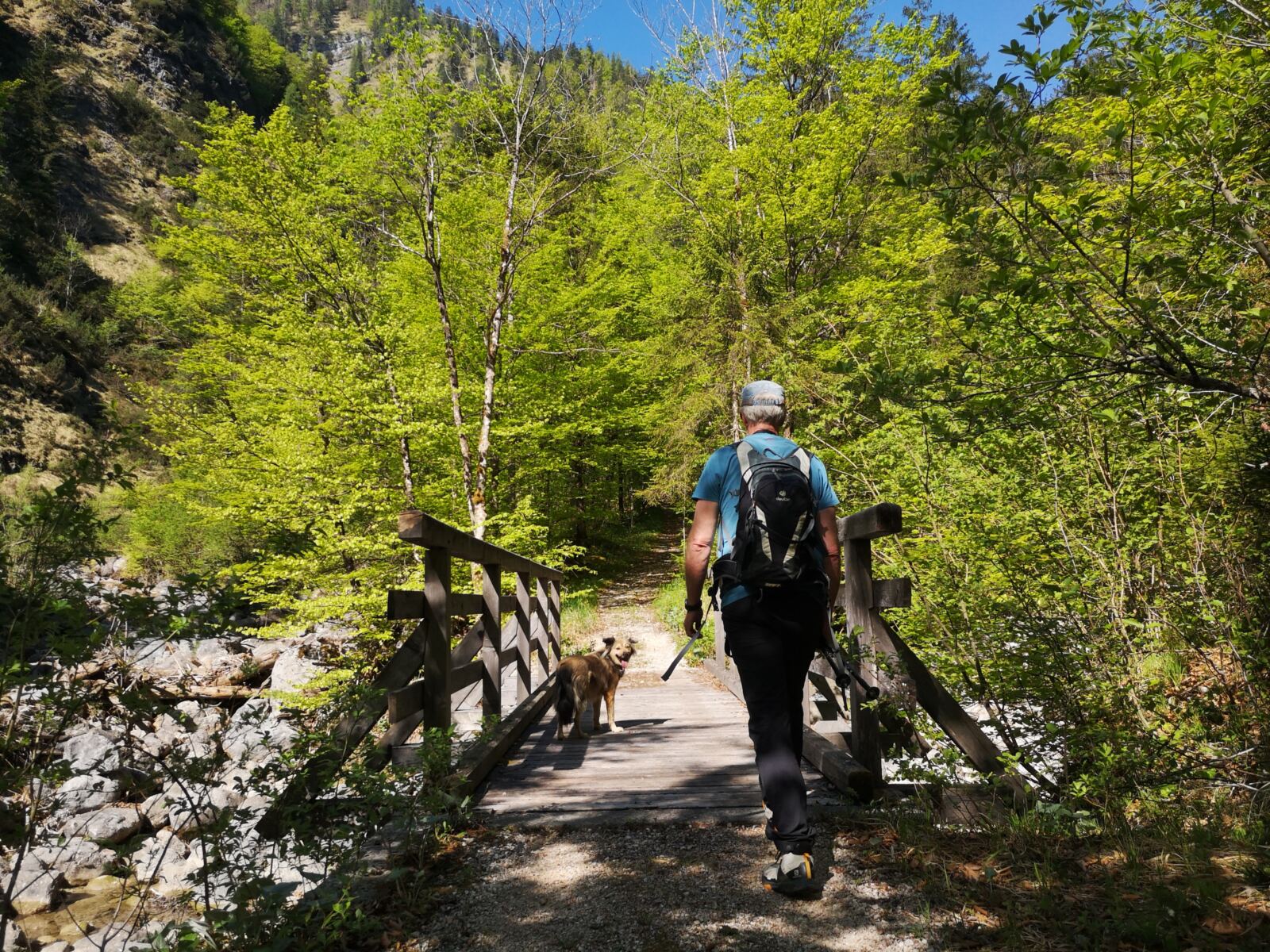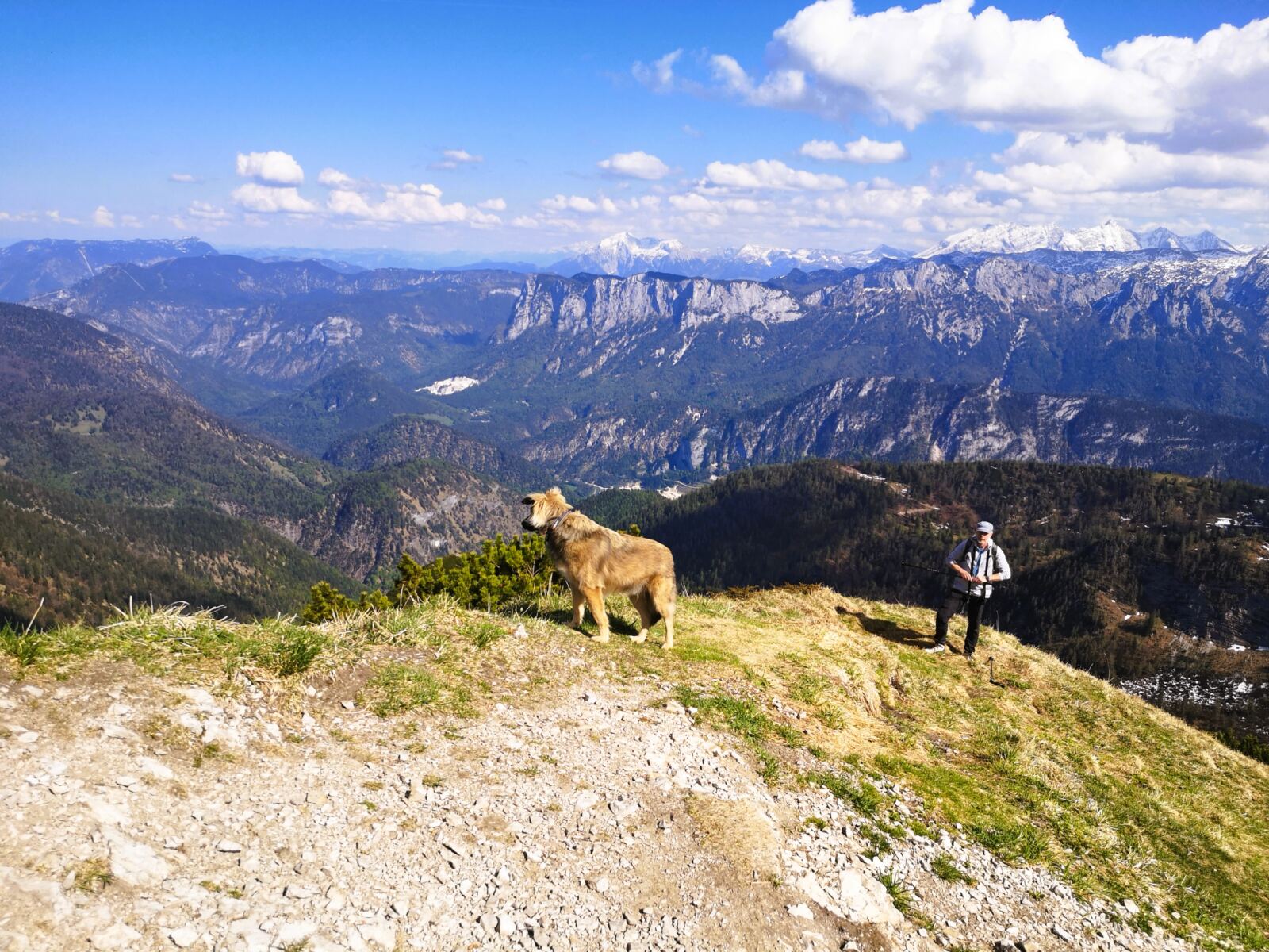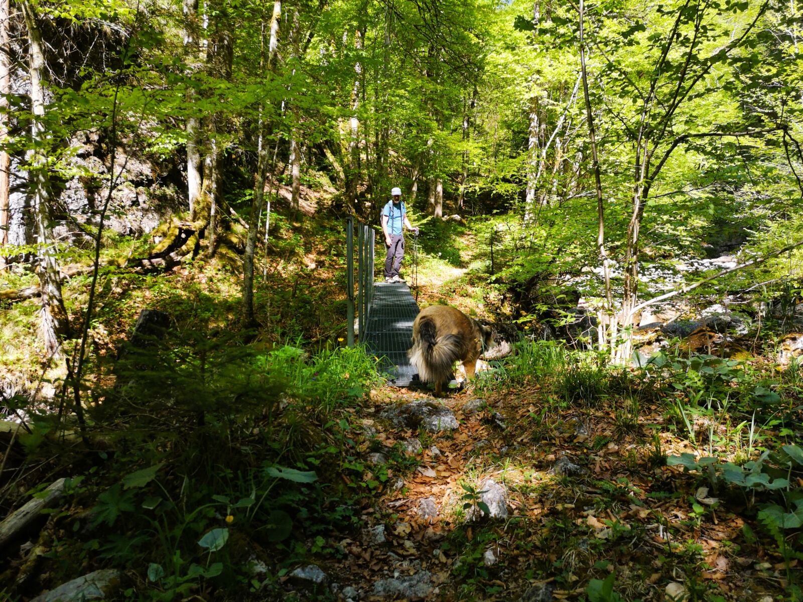 Der Weg ist durchgehend gut beschildert bzw. rot-weiß-rot markiert. Unter Füßen und Pfoten: überwiegend schmale Steige, die auf dem letzten Viertel steinig sind. Auf dem Roßkarsteig helfen Stöcke beim steilen Auf und Ab. Gut drei Viertel des Wegs wandern wir durch lichten Mischwald, den Rest schattenlos mit Weitblick. Technisch stellt der Weg keine Herausforderungen an Menschen und Hunde. Er verlangt jedoch Trittsicherheit und eine gute Kondition. Immerhin legen wir beim Aufstieg rund 1.400 Höhenmeter zurück.  Zwar treffen wir entlang des Wegs immer wieder auf Bäche. Trotzdem solltet ihr an warmen Tagen auch für den Hund ausreichend Wasser mitnehmen. Der Roßkarsteig ist bei Schnee absolut ungeeignet. Auch nicht zu empfehlen, wenn’s sehr nass ist. Dann könnte es hier für Zweibeiner viel zu rutschig werden.