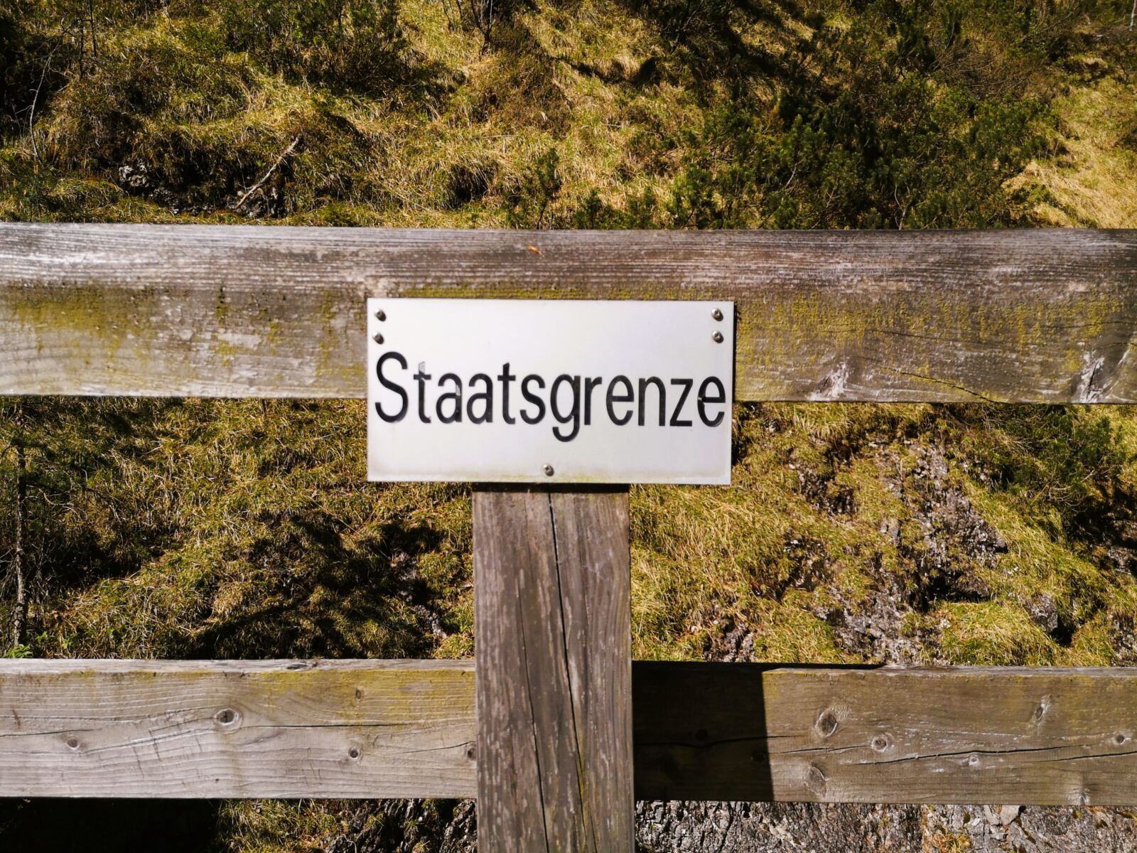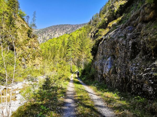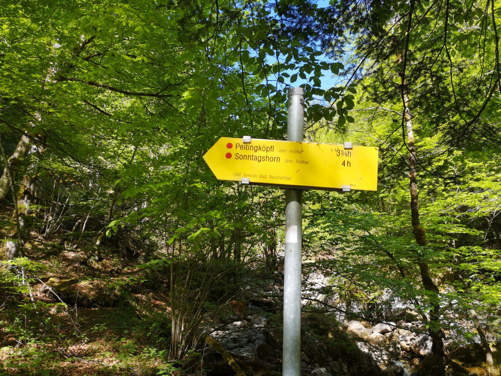 Der breite Forstweg führt uns zunächst gemächlich geradeaus. Wir überqueren eine Brücke mit dem Schild „Staatsgrenze“.  Der Steinbach begleitet uns nun linkerhand, während rechts Felswände aufragen. Und hoch oben, scheinbar unerreichbar, grüßt uns schon unser Ziel: das Sonntagshorn mit seiner charakteristischen Form.