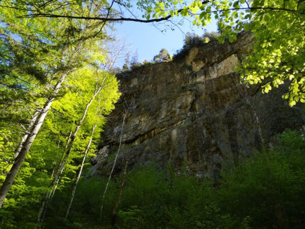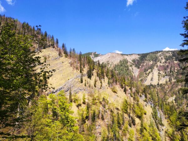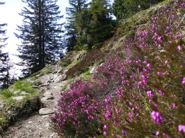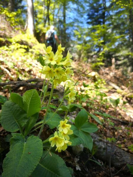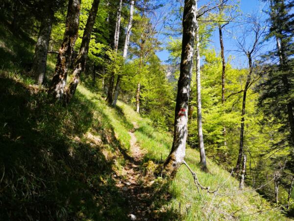 Jetzt wird’s ernst: In knackigen Serpentinen windet sich der Steig, teils schmal und wurzelig, durch den dichten Bergwald. Es geht zügig bergauf, nur unterbrochen von wenigen sanfteren Passagen. Immer wieder öffnen sich kleine Fenster mit Ausblicken hinauf auf die Berge. Verschnaufpausen lohnen sich also doppelt.