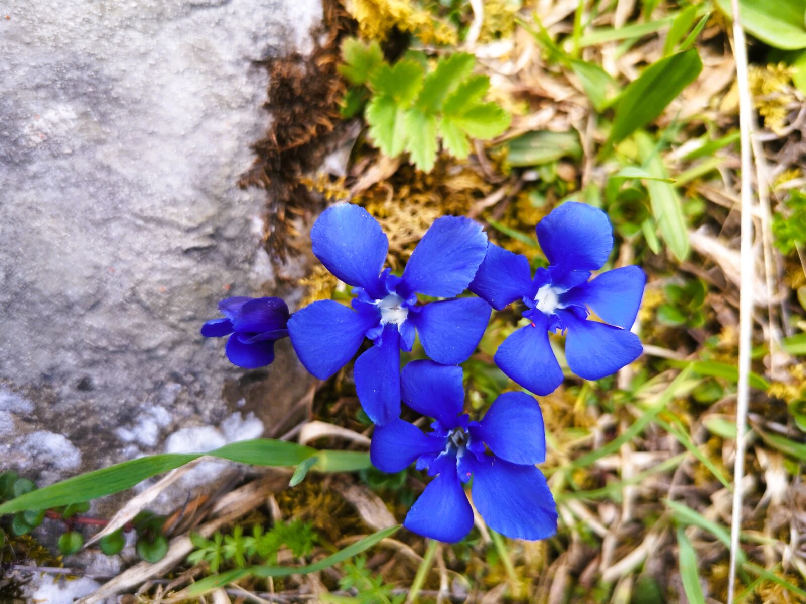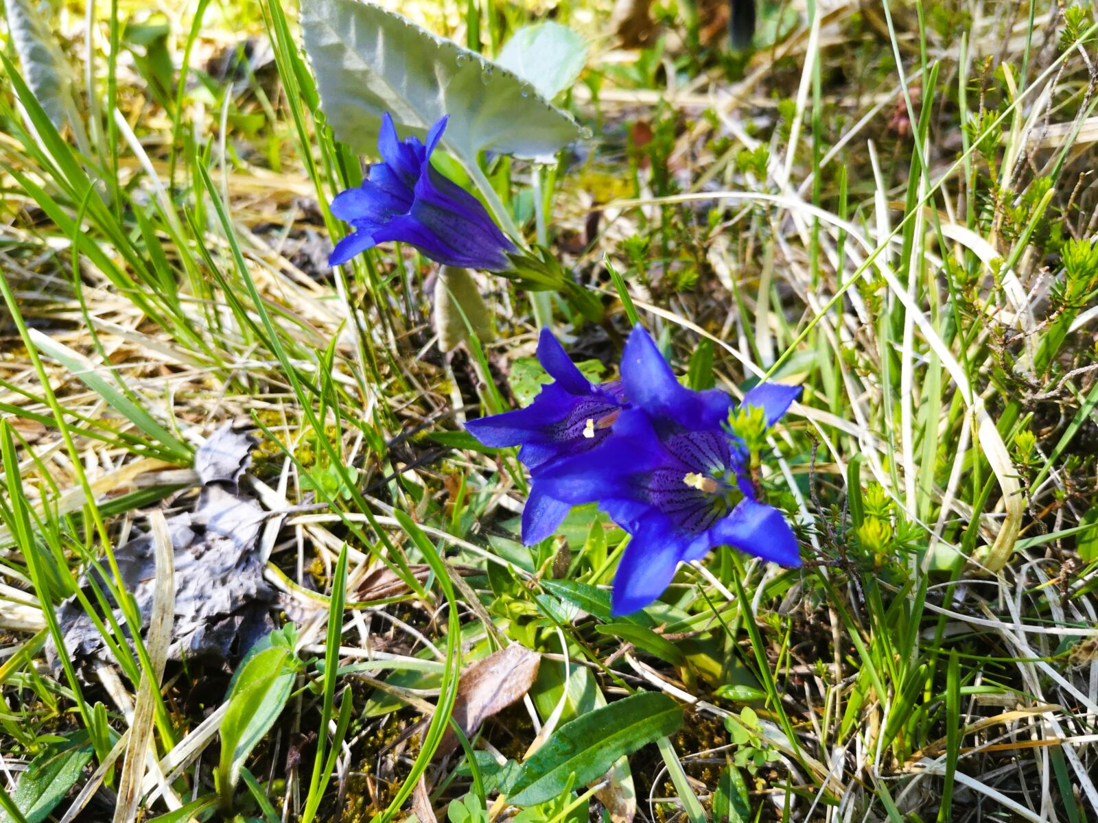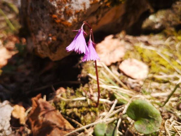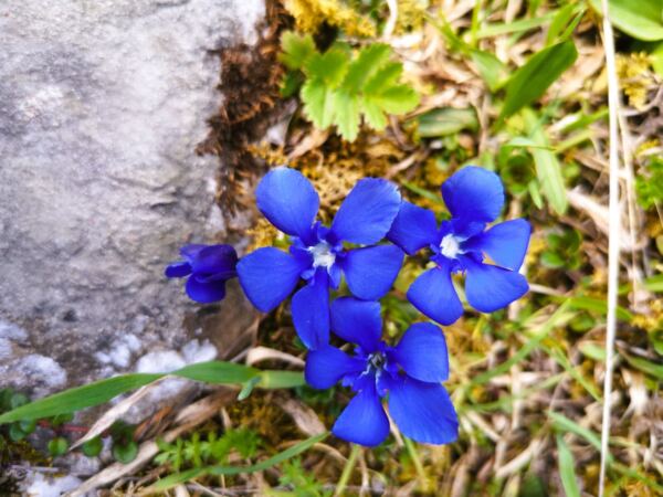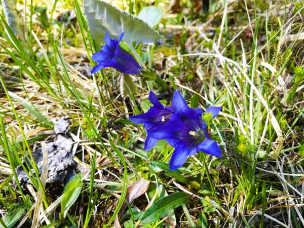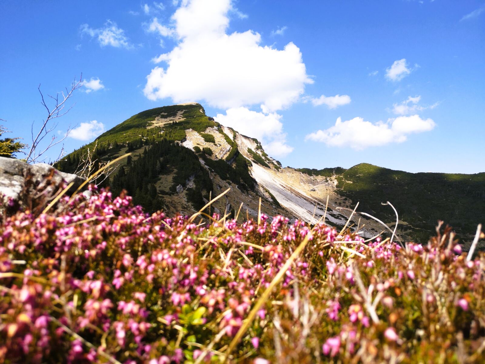Doch schon der Weg hinauf ist etwas für Genießer – wenn sie etwas Ausdauer mitbringen.  Wir lieben den langen, kaum begangenen Anstieg über das Roßkar. Selbst an warmen Feiertagen treffen wir hier kaum einen Menschen. Das abgelegene Kar zwischen Sonntagshorn und Peitingköpfl ist ein Relikt der Eiszeit, von einem Gletscher geformt. Heute dominieren hier Latschen, Almwiesen und Quellbäche vor schroffen Felswänden.  Besonders schön im Frühling, wenn wilde Orchideen am Wegrand blühen und Krokusse die Wiesen mit Weiß und Violett sprenkeln. Dazwischen leuchten stängelloser Enzian und Frühlings-Enzian in Tiefblau – ein toller Kontrast zu den narbigen, fast weißen Felsbrocken aus Dachsteinkalk, die auf den Weiden liegen. Expert:innen erkennen daran:  Das Gebiet gehört geologisch zu den nördlichen Kalkalpen.  Auch das Sonntagshorn, das wir schon zu Beginn unseres Aufstiegs sehen, präsentiert sich in weiß mit Streifen aus grünen Latschen.  Anders als die schroffen Gipfel weiter südlich zeigt es einen eher sanften, abgerundete Gipfelaufbau, der uns an die Mützen eines Mainzelmännchens erinnert. Diese Mütze stellt technisch keine Anforderungen.  Nach dem langen Aufstieg bis zum Roßkarsattel braucht es auf den Gipfel eben noch ein wenig Puste.