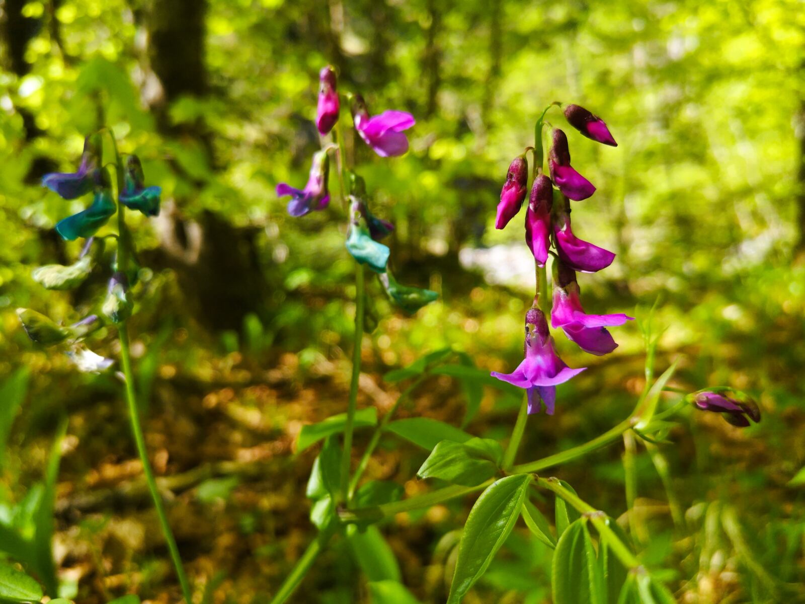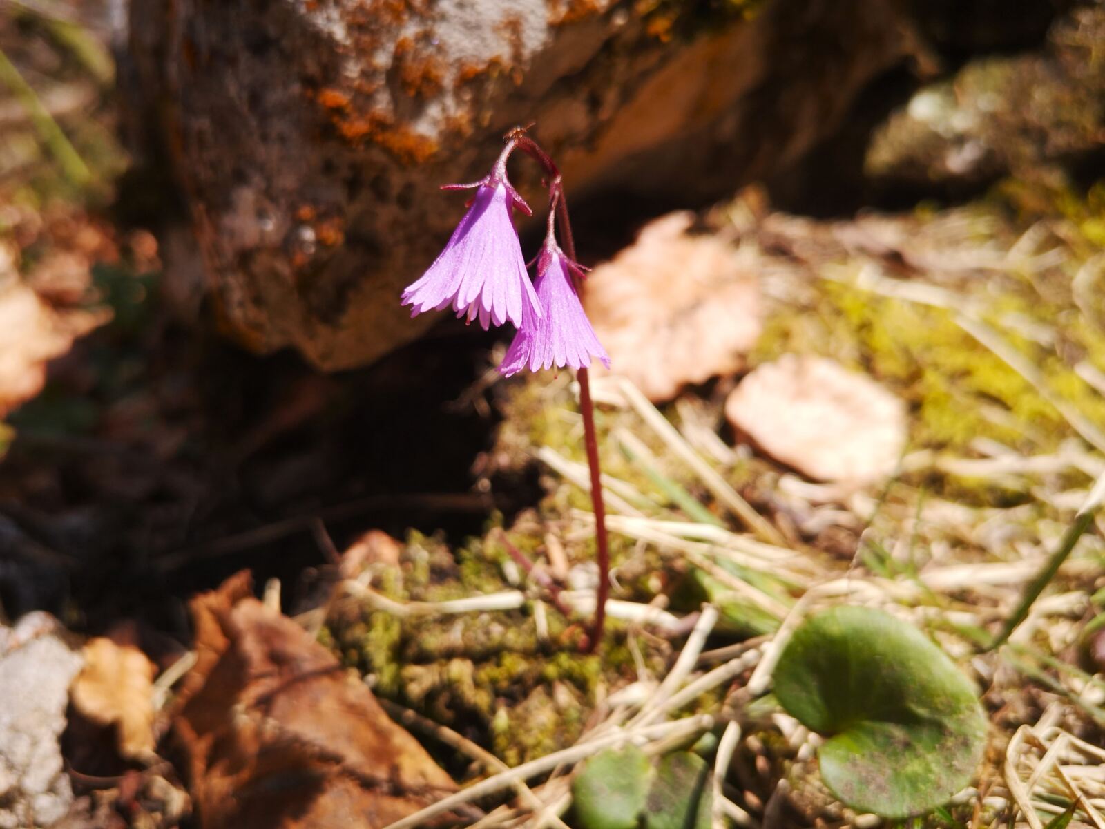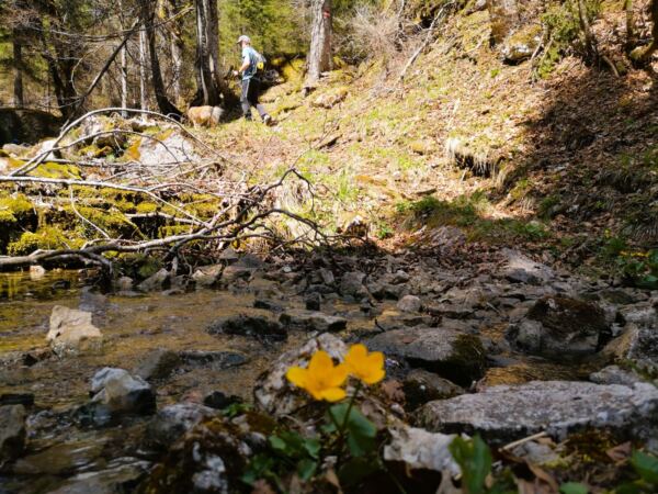 Weitgehend eben laufen wir zunächst durch verbuschtes Gelände und erreichen einen Bach. Happy Hund! Amos legt sich sofort hinein und kühlt sich den Bauch. Der rot-weiß-roten Markierung an Felsen und Bäumen folgend, steigen wir sanft bergauf und kommen bald zu einem offenen Weidegebiet. Herrlich, dieser Blumenteppich – und die Rundumsicht auf die Felswände.