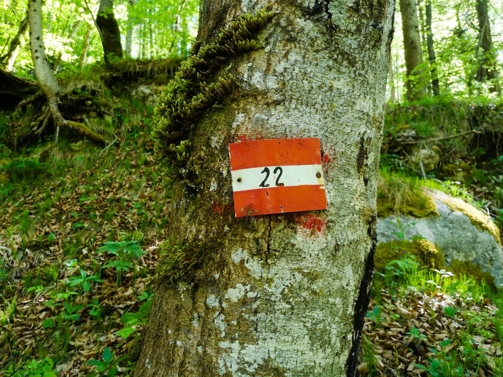 Nach gut der Hälfte des Steigs grüßt uns ein charmantes Detail am Weg: Ein kleines „Wegbücherl“, sicher verwahrt in einer Metallkassette auf einem Holzpfahl. Wer hier langläuft, merkt schnell, wie viel Mühe die Wegwarte investieren, um diesen wilden Pfad in Schuss zu halten – durchgesägte Stämme, die der Wind über den Weg geworfen hat, zeugen davon. Das ist uns ein Dankeschön im Wegbücherl wert. ♥️