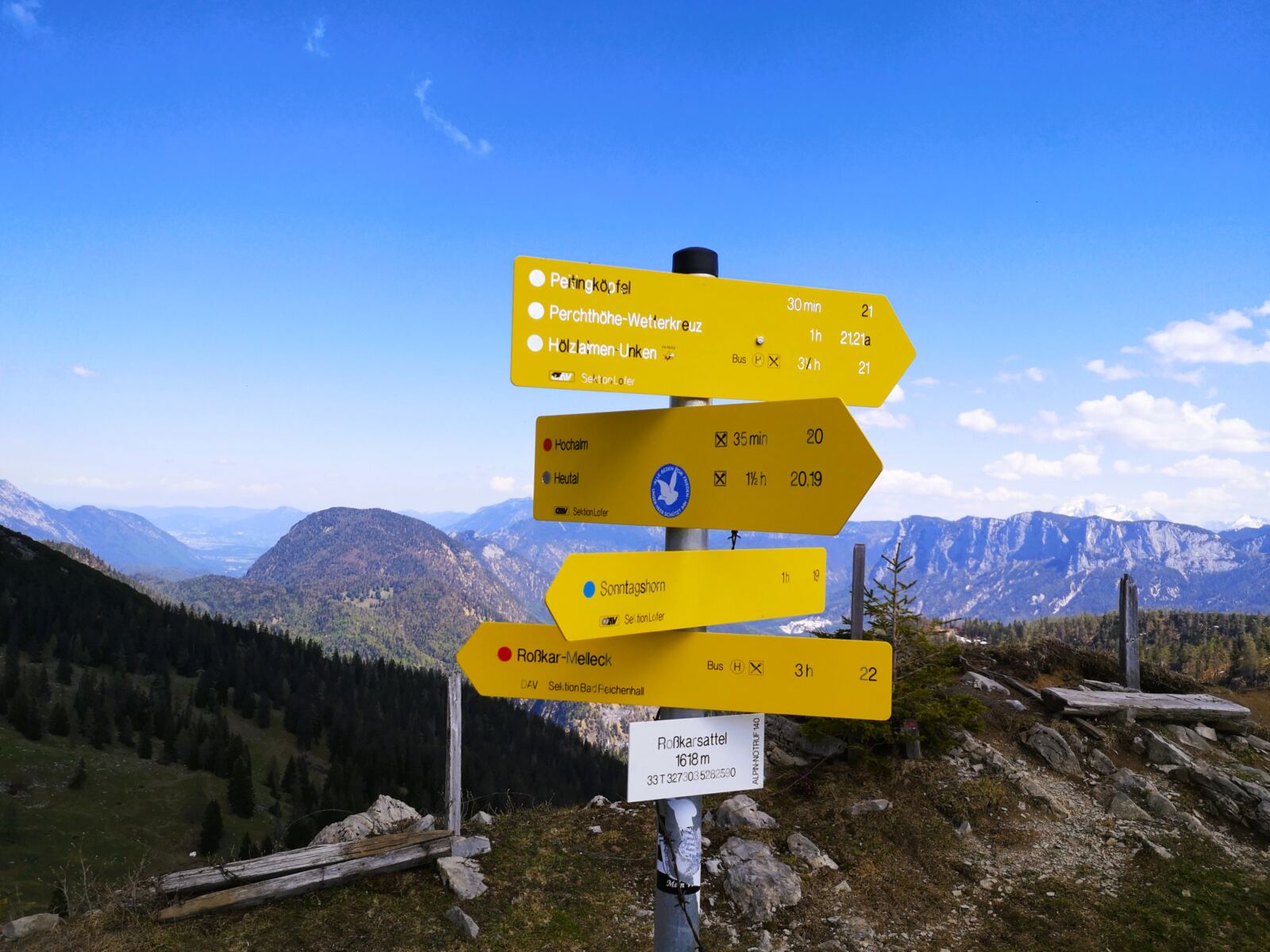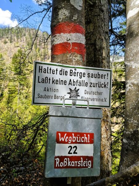 An der nächsten Weggabelung halten wir uns links. Hier beginnt der eigentliche Roßkarsteig. Er ist gut markiert mit rot-weiß-roten Zeichen und der Nummer 22. Schon nach wenigen Minuten dreht der Steig nach links, erneut ausgeschildert  „Sonntagshorn über Roßkar“.