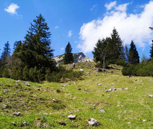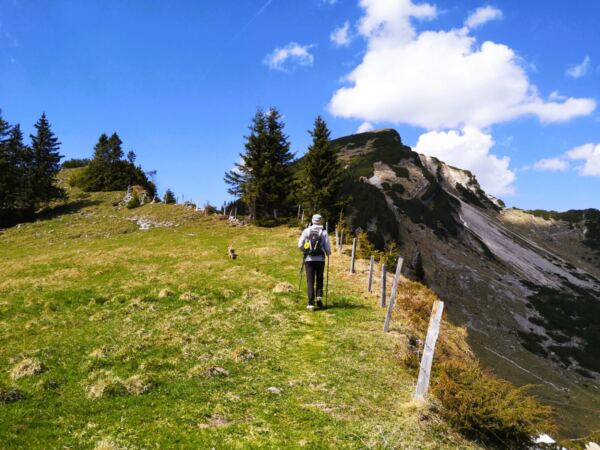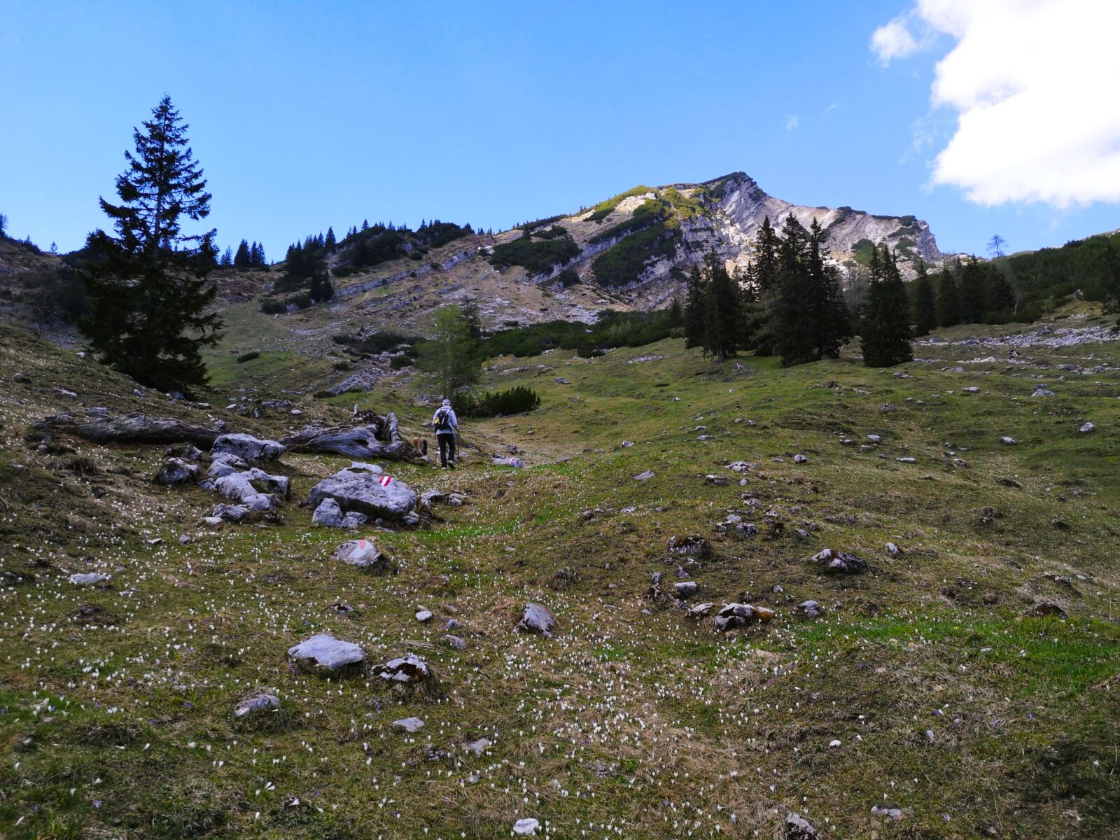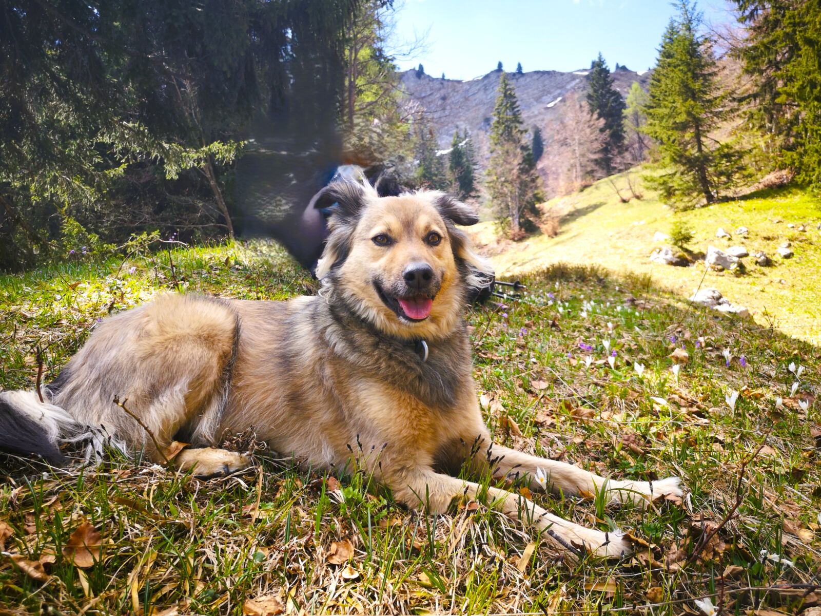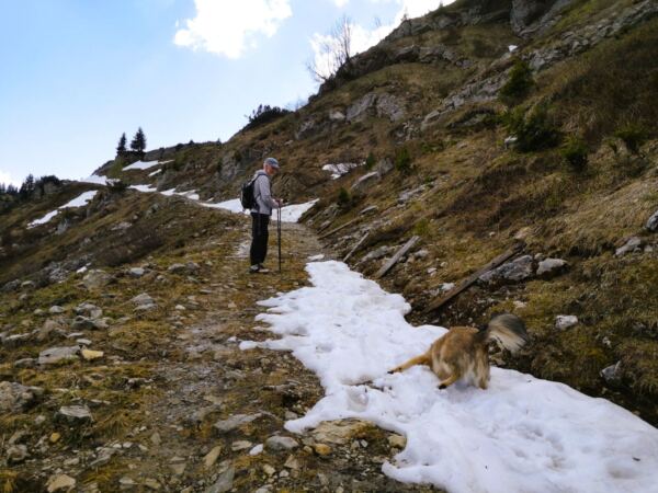 Durch Krokusse steigen wir aufwärts. Unser Pfad mündet auf einen Wirtschaftsweg, dem wir links folgen, stetig bergauf. Amos wälzt sich in den letzten Schneeflecken auf dem Weg. Nach wenigen Minuten ist der Roßkarsattel erreicht – ein markanter Kreuzungspunkt. Hier stößt auch der deutlich kürzere Aufstieg aus dem Heutal auf unsere Route. Man merkt es: Jetzt wird’s etwas voller.