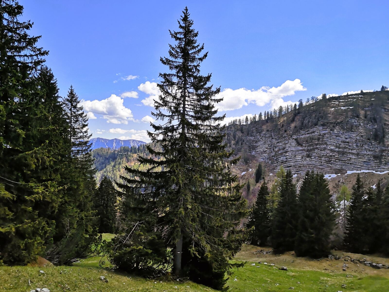 Nach gut 2,5 Stunden auf dem Steig passieren wir einen offenen Weidezaun mit Hinweisschild „Weidegebiet – Hunde an die Leine“. Wir haben das Gelände der Ennsmannalm erreicht. Vieh ist jetzt im Frühling noch nicht unterwegs.