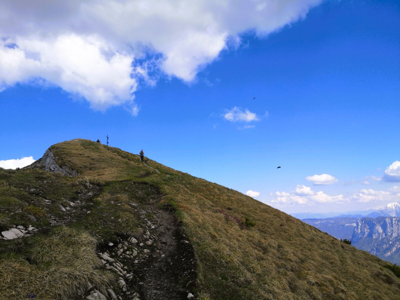 Die letzte Etappe steht an: der finale Aufstieg zum Gipfel. Vom Roßkarsattel aus folgen wir dem Wegweiser „Sonntagshorn – 1 h“. Es geht zunächst gemächlich über eine offene Almfläche, dann durch einen zunehmend steinigen und wurzelreichen Steig im Südhang. Serpentine um Serpentine arbeiten wir uns nach oben, und mit jeder Kehre wird die Aussicht weiter.