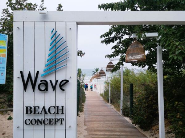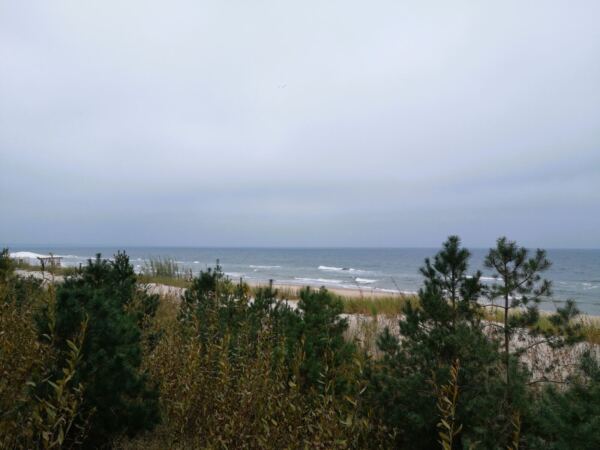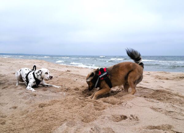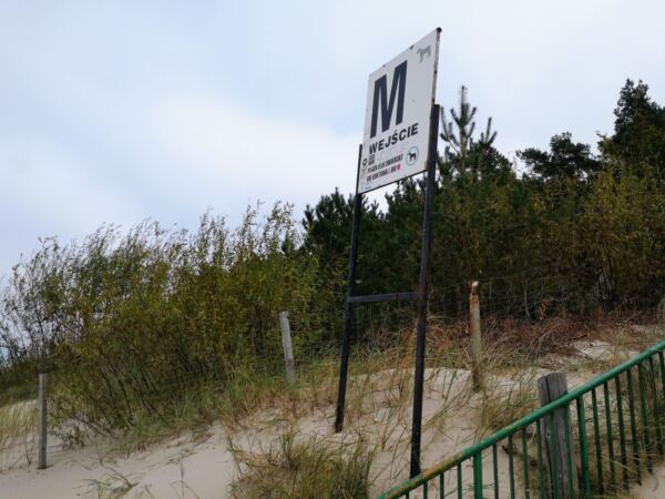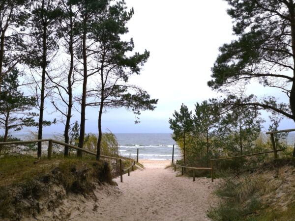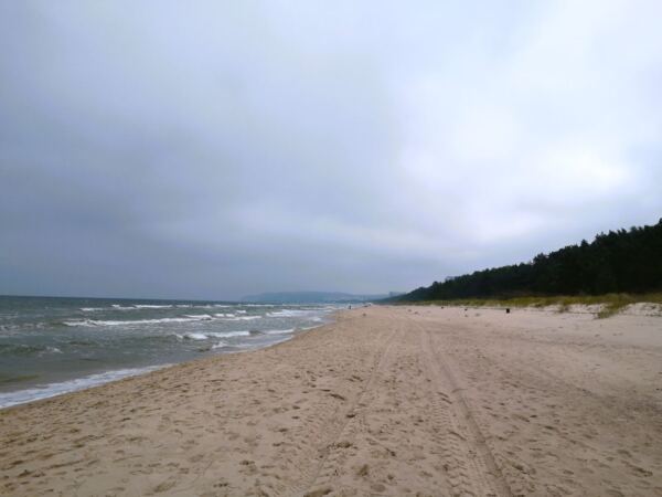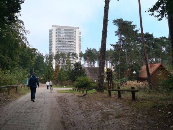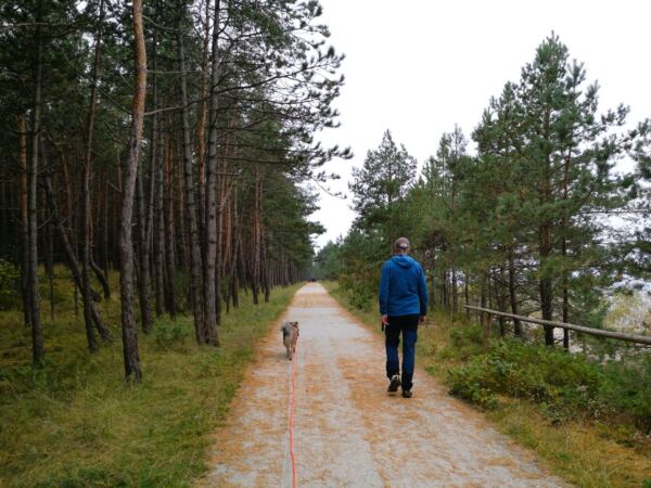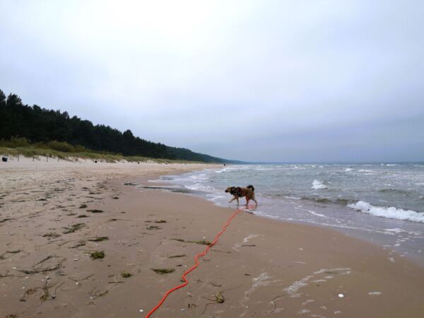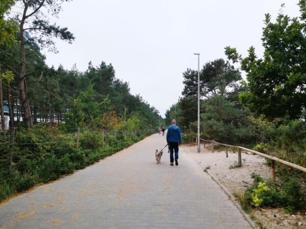 Startpunkt unserer Tour ist der Campingplatz „Forest Camping“ am Stadtrand von Misdroy. Über die Hauptstraße Polna laufen wir stadteinwärts. Am Kreisverkehr halten wir uns links. Über die Straße Wesola erreichen wir den Beginn der Strandpromenade Bohaterów Warszawy. Dahinter liegt der gepflasterte Fußweg, der zwischen Dünen und Wald entlangführt. Dem folgen wir links ab. Vorbei an Beachbars zur Linken und den modernen Türmen des Wellness Hotels Wave zur Rechten laufen wir immer geradeaus Richtung Swinemünde. Der gepflasterte Strandweg geht schließlich über in einen breiten Waldpfad, den sich Fußgänger mit Radlern teilen. Nicht viel los hier heute. Amos kann freilaufen. Schließlich erreichen wir den Hundestrand von Misdroy. Hier glaubt man sofort, dass die Strände zwischen Swinemünde und Misdroy zu den schönsten an der gesamten polnischen Ostsee gehören. Am breiten Strand laufen wir Richtung Swinemünde. Schließlich wechseln wir vom Hundestrand zurück auf den Wanderweg zwischen Wald und Wasser Richtung Swinemünde.