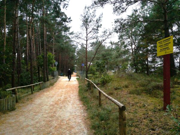 Der gepflasterte Strandweg geht über in einen breiten Waldpfad, den sich Radler und Fußgänger teilen.