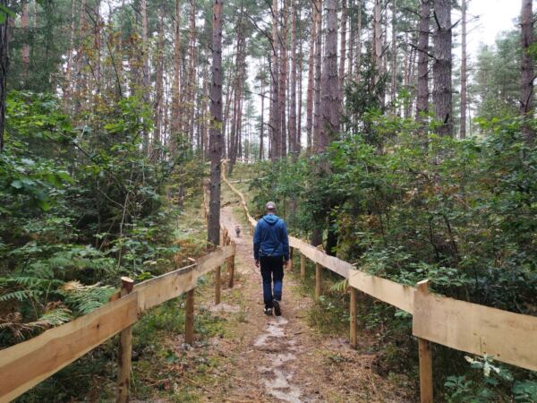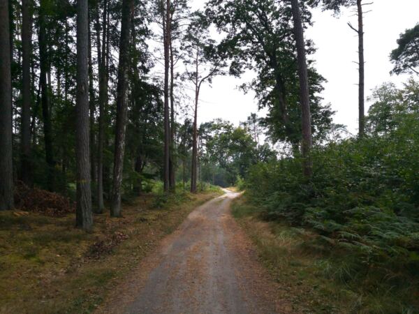 Wir laufen zurück durch den Wald und biegen links ab. Dieser schöne eingezäunte Weg führt über über eine Kuppe hinauf und hinunter zur Ostsee.
