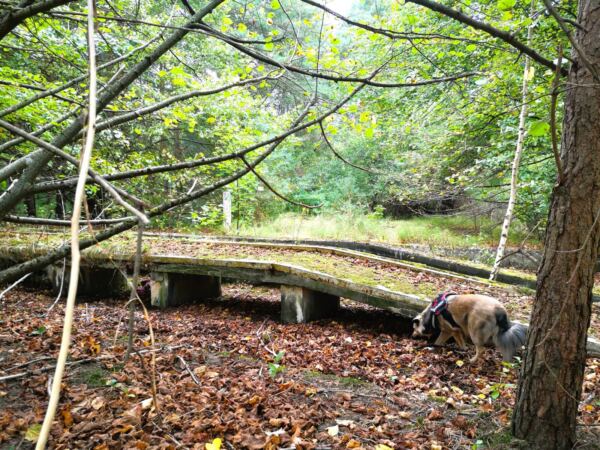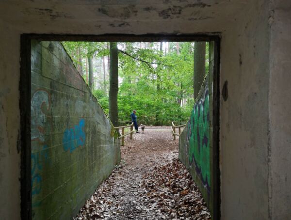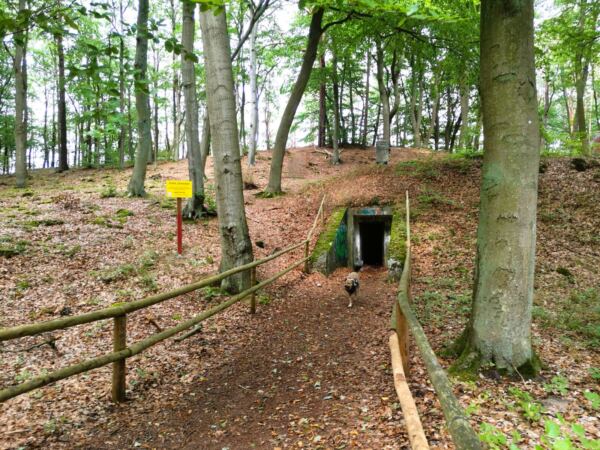 Wir laufen zurück, wie wir gekommen sind. Bei nächster Gelegenheit nehmen wir den markierten und Strandzugang mit Holzgeländer, der nun links von uns im Wald vom Jakobsweg abbiegt. Nach einigen besonders schönen Metern durch den Wald erreichen wir wieder den Strand. Hinter dem Hundestrand am Abgang M wechseln wir zurück in den Wald und nehmen an der nächsten Kreuzung kurz vor Misdroy den Weg, der parallel zu unserem Wanderweg verläuft. Dieser Plattenweg bringt uns Richtung Misdroy an den Resten der Batterie Liebesseele aus dem Zweiten Weltkrieg vorbei. Die Eingänge zum unterirdischen Bunker sind gut erhalten und frei zugänglich. Die Wahrscheinlichkeit ist hoch, dass hier Menschen drinstehen – also nicht erschrecken (anders als Frauchen, die den Schatten in der Höhle für einen Bären gehalten hatte. 😱😁).