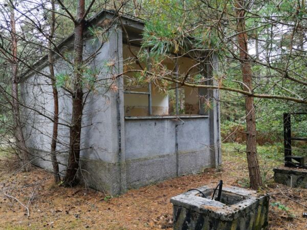 Unser Wanderweg knickt links ab und führt ein kleines Stück bergauf, dann wieder bergab und mündet in einer T-Kreuzung auf einen geschotterten Wirtschaftsweg. Wir biegen rechts ab. Einige hundert Meter laufen wir auf dem Wirtschaftsweg entlang. An einer Gabelung halten wir uns rechts und folgen dem nun wieder weichen Waldpfad, der mit dem Muschel-Symbol des Jakobswegs gekennzeichnet ist, in den Wald hinein. Immer weiter laufen wir auf diesem Weg entlang Richtung Swinemünde. Schließlich erreichen wir ein Gelände mit vielen Resten militärischer Anlagen. Hier schauen wir uns ein wenig um. Wer wollte, könnte jetzt noch eine gute Stunde weiterlaufen zur Glocke. Der mächtige Bunker, der entfernt an eine Rakete in Startposition erinnert, diente den Deutschen als Feuerleitstand für die Geschütze der Strandbatterie Göben. Heute nutzt ihn die Feuerwehr als Beobachtungsturm bei Waldbrandgefahr. Der Turm liegt direkt am Radweg R 10, beherbergt ein kleines Museum. Besucher:innen dürfen auch die Plattform erklimmen. Der Blick über die Bucht muss großartig sein.