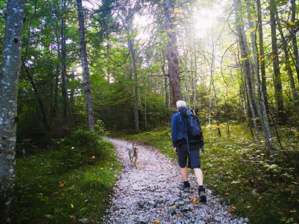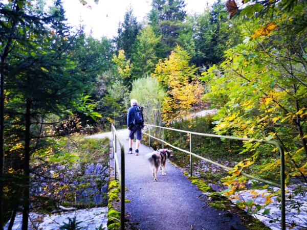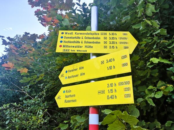 🗺️ Wegbeschreibung: Ausgangspunkt ist der Parkplatz an der Talstation der Karwendelbahn in Mittenwald. Wir überqueren die Alpenkorpsstraße. Auf der anderen Seite, direkt gegenüber der Parkplatz-Zufahrt, entdecken wir bereits einen Schilderbaum. Wir folgen dem Wegweiser „Dammkarhütte über Ochsenboden“ drei Schritte an der Infotafel vorbei, steigen die Stufen hinab und halten uns links Richtung Bundesstraße 2. Der gepflasterte Weg bringt uns durch die Unterführung. Dahinter geht es wieder eine Gittertreppen hinauf (unser Hund könnte sie umlaufen) und weiter bergauf und in den Wald hinein. Schon wenige Schritte später stoßen wir auf den nächsten Wegweiser „Damkarhütte über Ochsenboden“. An jeder Kreuzung können wir uns auf diesen Wegweiser verlassen.