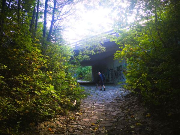 Als Rückweg könnte man nun den kürzeren Weg über das Bankerl nehmen. Doch der ist steil, durchsetzt mit dicken, scharfkantigen Gesteinsbrocken, am Ende schließlich geteert. Kein Gewinn – und für unseren Freund kein Vergnügen. Deshalb nehmen wir den gleichen schönen Weg zurück, den wir gekommen sind.