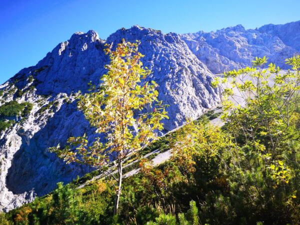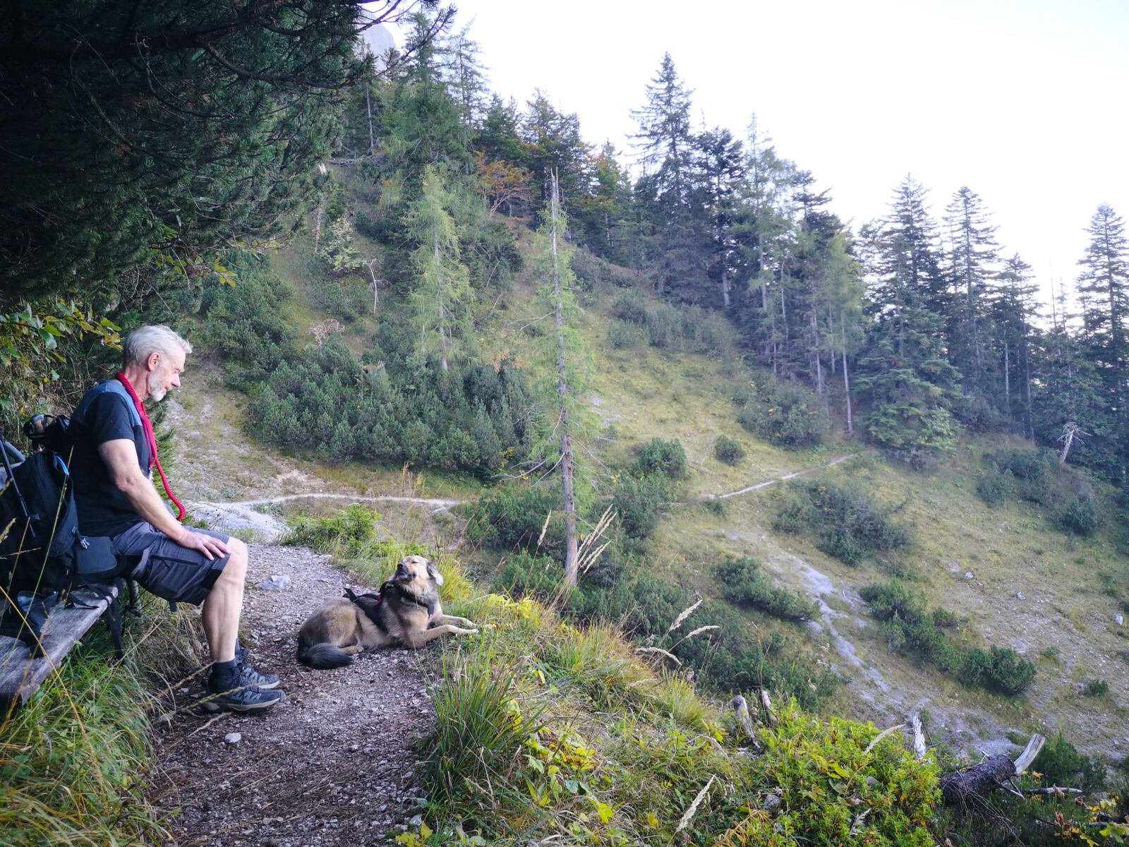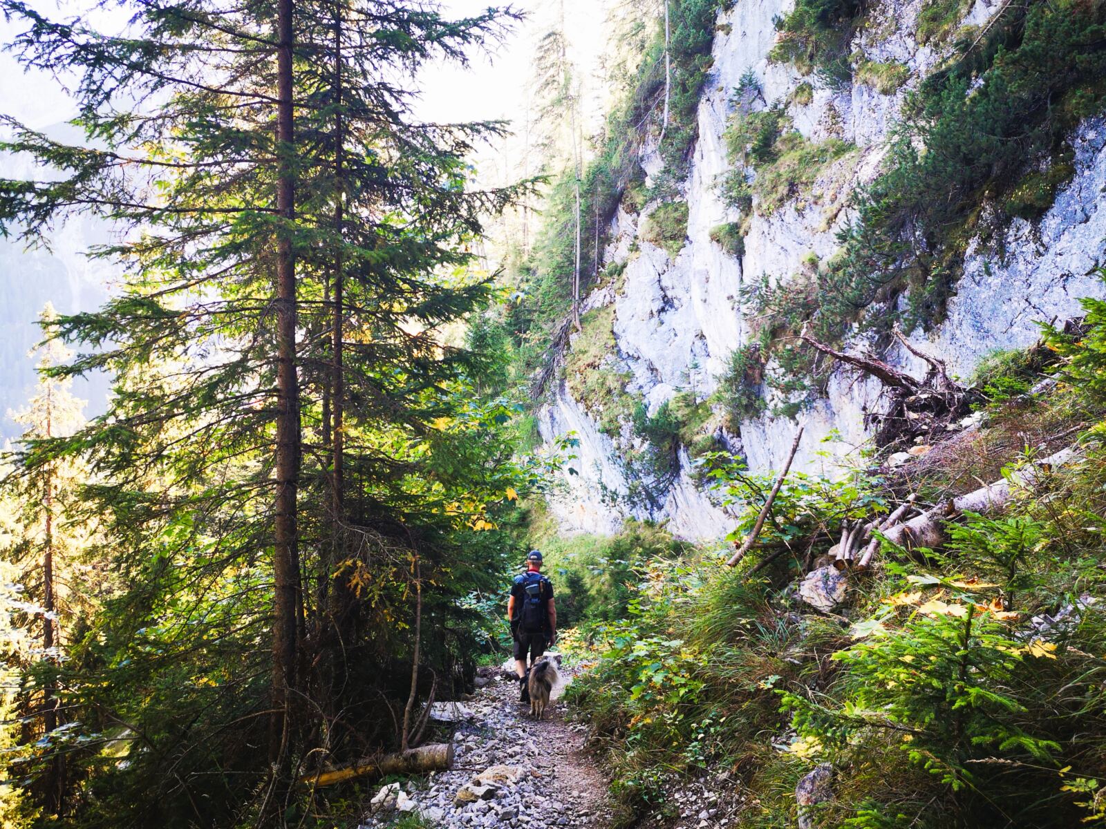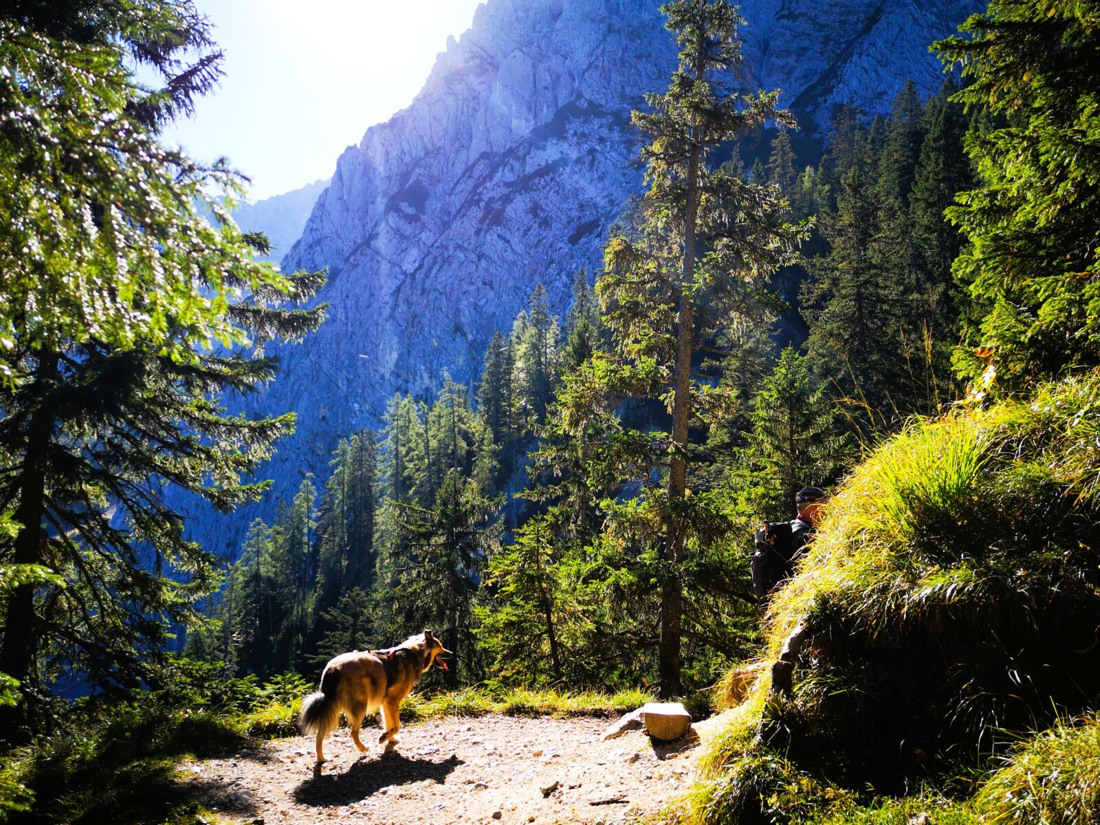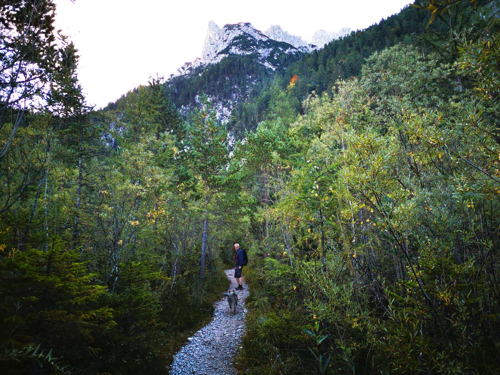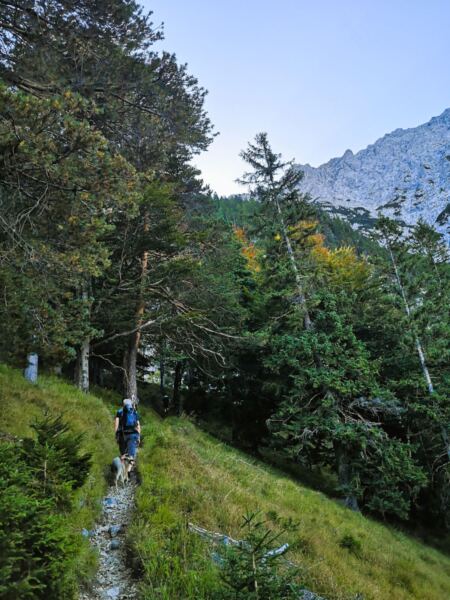 Die Hütte zwischen Predigtstuhl und Kreuzwand, 1951 gebaut und bis heute privat geführt, ist bei Wander- und Kletterfans gleichermaßen beliebt. Viele nehmen den kürzeren Weg ab Seilbahn Talstation übers „Bankerl“ hinauf (ca. 2 h). Doch sehr viel schöner – auch für den Hund – ist der längere Aufstieg über den Ochsenbodensteig (ca. 3 h). Der sehr gepflegte Bergsteig windet sich durch einen traumhaften Bergwald mit Fichte, Lärche, Bergahorn und Kiefer, dicken Graspuscheln am Wegrand und vielen bunten Alpenblumen wie Habichtskraut und Kugelblume, die auf den offenen Stellen und Wegrändern gut gedeihen. Der Weg bietet über weite Abschnitte Panoramablicke auf Mittenwald, Ester- und Wettersteingebirge, Zugspitzblick inklusive. Im frühen Herbst mit Indian Summer Feeling. Besonders spektakulär: Der Ochsenbodensteig führt uns schließlich am Fuß der steil abfallenden Kreuzwand entlang. Hier lassen sich die typischen Formen eines Kars – entstanden, als mächtige Gletscher nach der Eiszeit abschmolzen – besonders gut bestaunen. Wenig später zeigt sich uns der Kessel des Dammkars mit seinen steilen Wänden und den weiten Schuttflächen in ganzer Pracht. Wer zu Dammkarhütte wandert, spaziert also durch ein Bilderbuch der Erdgeschichte.