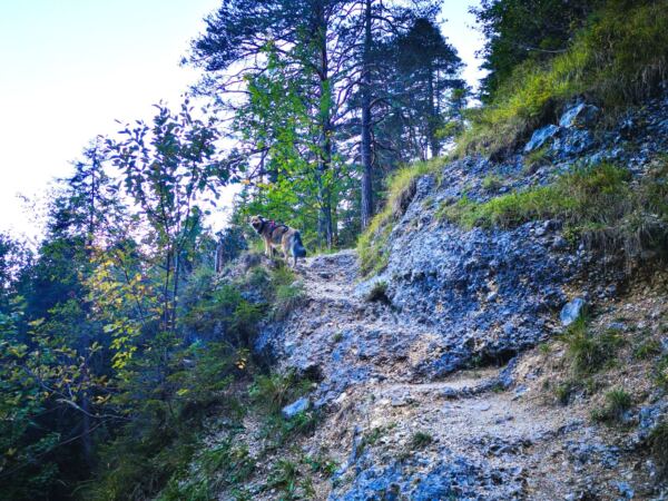 Wir sind auf Bergsteigen unterwegs, die zunächst weich und wurzelig sind, später zunehmend steinig werden. Unterwegs wechseln sich Sonne und Waldschatten ab. Wer frühmorgens startet, wandert weitgehend im Schatten des Hangs bergauf. Ideal an sehr warmen Tagen. Ausreichend Wasser für Mensch und Tier einpacken, denn unterwegs haben wir bislang nur eine Wasserstelle für den Hund entdeckt – und liegt kurz nach dem Startpunkt.