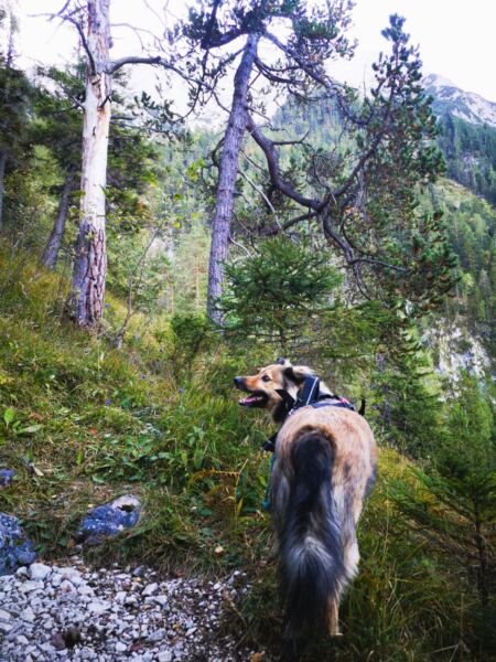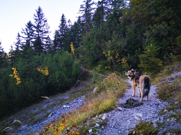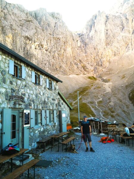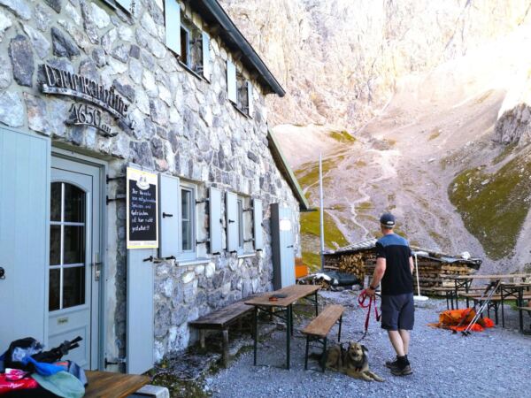 Sie gehört für uns zu den großartigsten Hütten in der Umgebung von München: die Dammkarhütte (1.650 m) über Mittenwald. Das liegt nicht an ihrer Küche (da kennen wir andere Ziele für verwöhnte Gaumen 😊), sondern an ihrer spektakulären Lage. Die Dammkarhütte (geöffnet April/Mai bis Ende September) thront auf einem latschenbewachsenen Plateau inmitten einer Mondlandschaft. Eine freundlich-einladende Insel in einem Strom knochenweißer Gesteinsbrocken. Unwirklich schön! ✨🐶