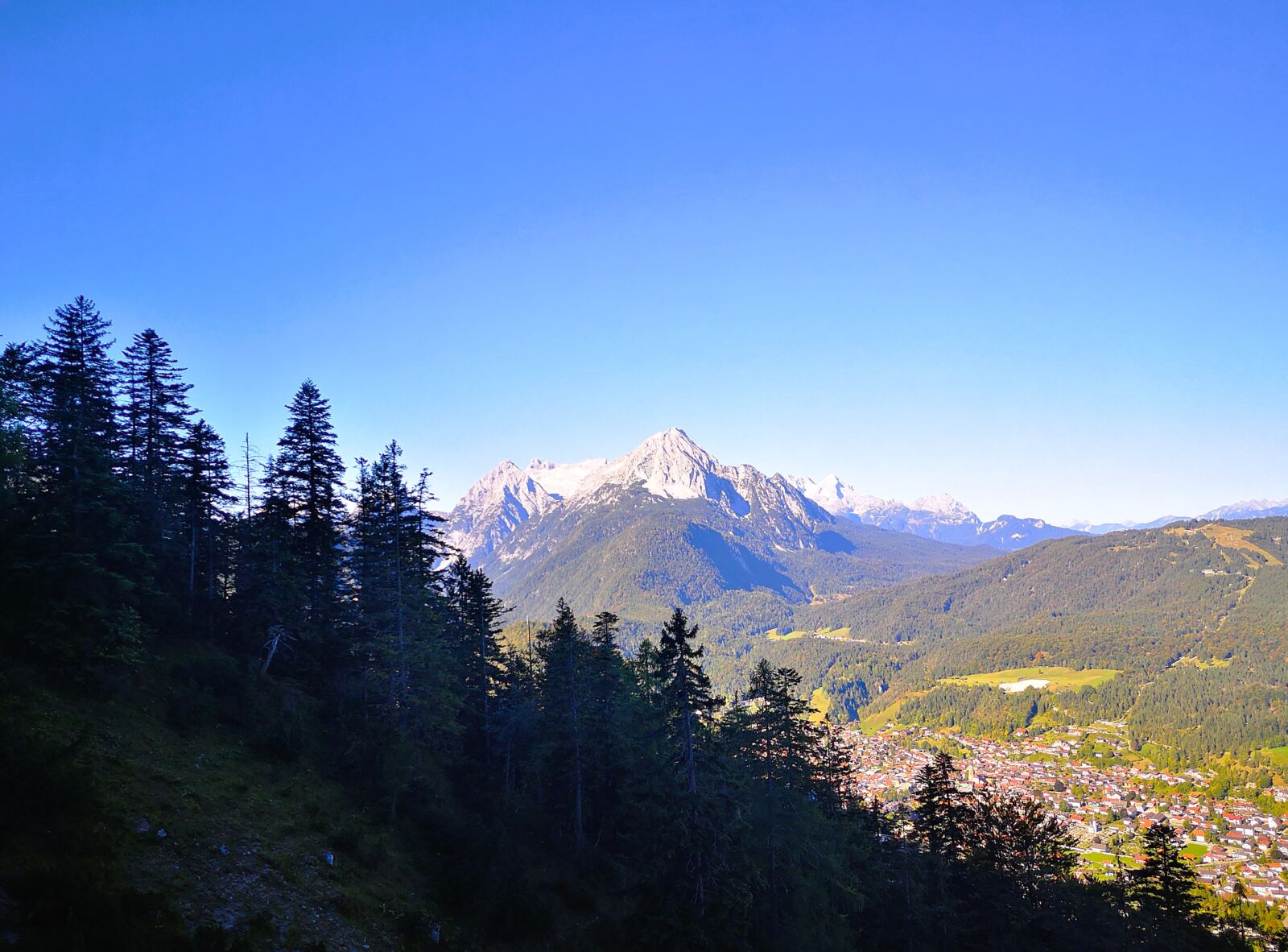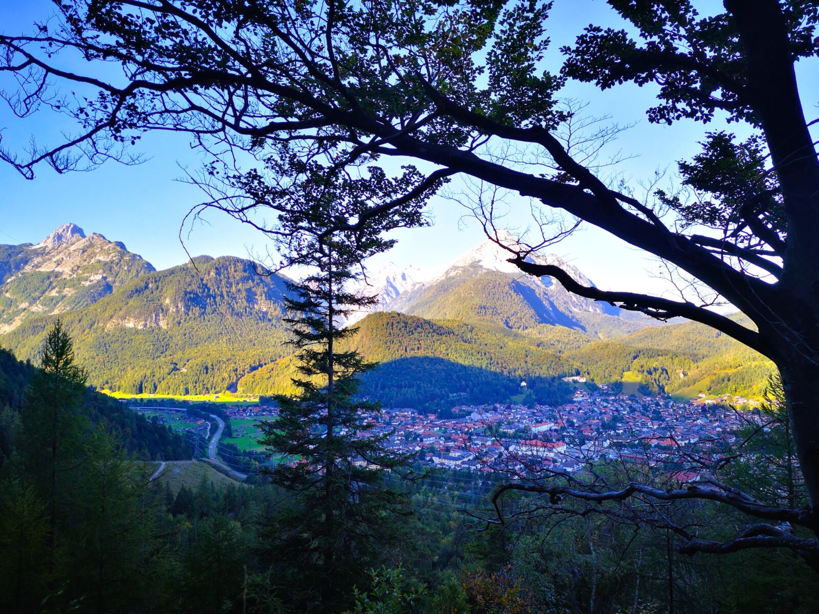 Blick über Mittenwald Richtung Kranzberg und Zugspitze