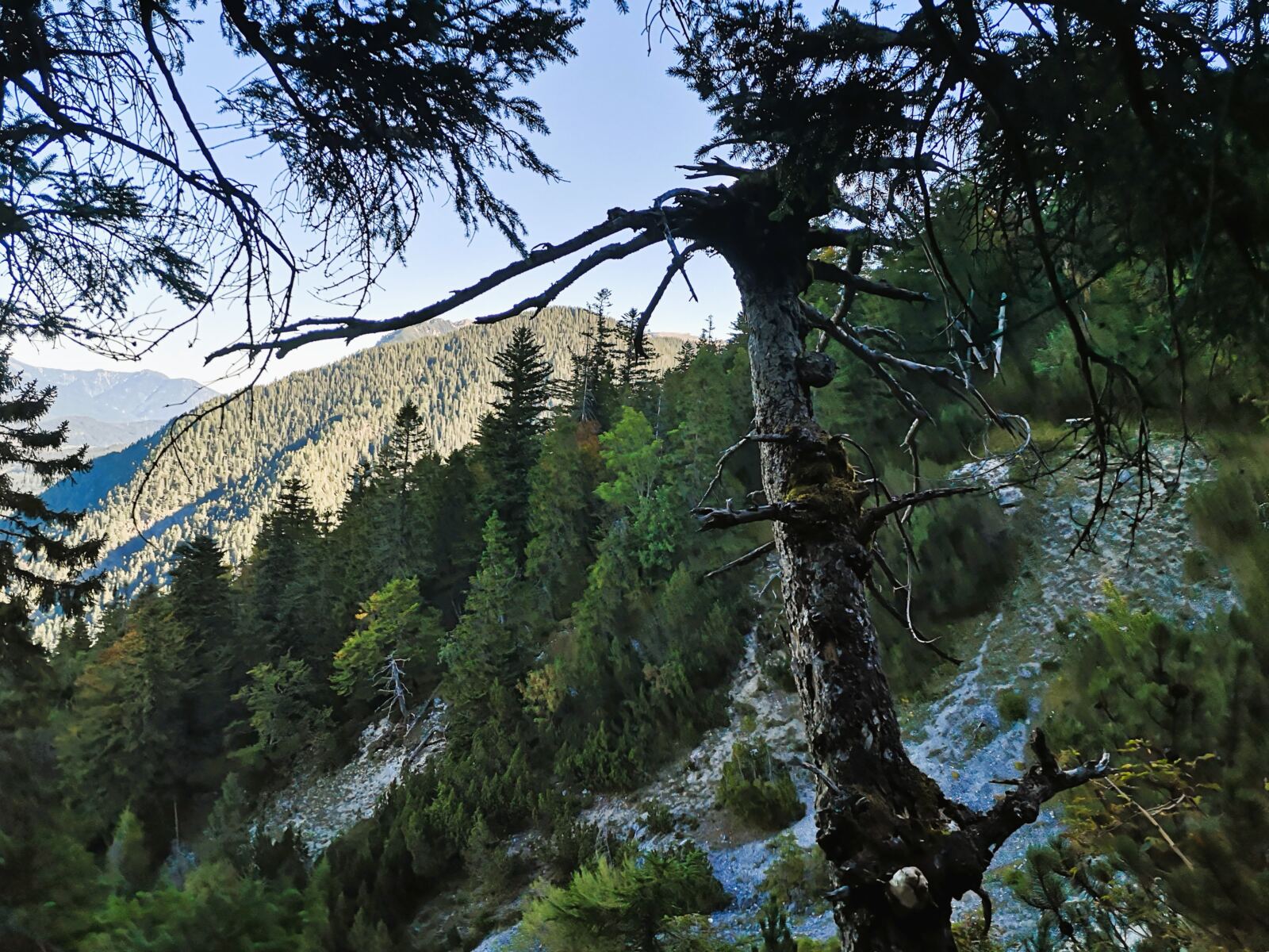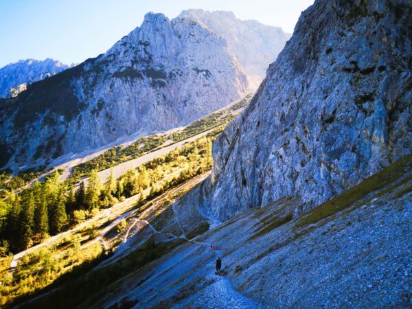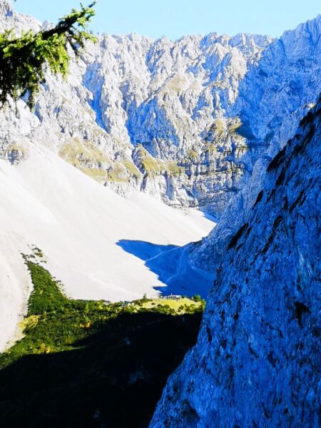 Hinter einem Waldstück biegt unser Weg schließlich um die Bergflanke. Vor uns öffnet sich zum ersten Mal der Blick hinein in das Dammkar. Beeindruckend! Wer genau hinschaut, entdeckt die Dammkarhütte, die von weitem winzig klein auf ihrem Plateau zwischen steilen Felswänden thront.