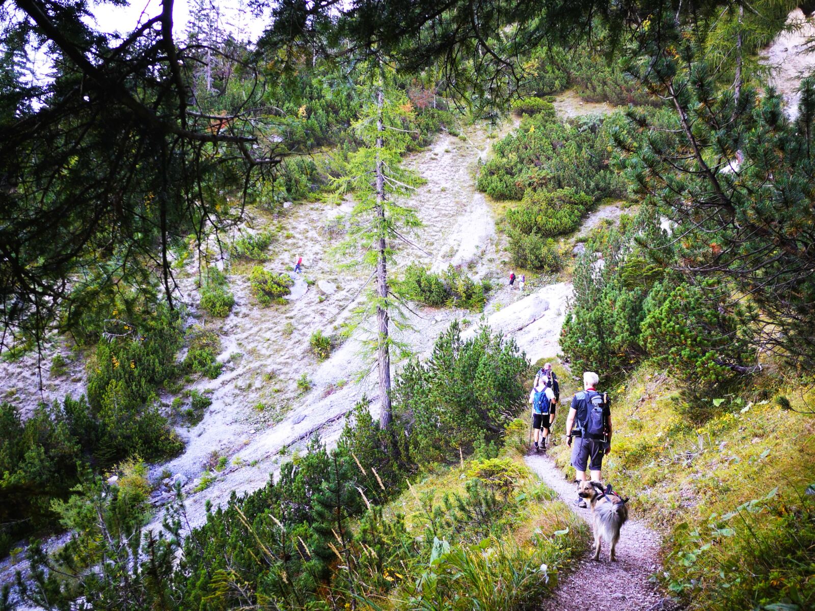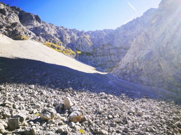 ⚠️ Von der Dammkarhütte könnte man durch das hinter Dammkar hinaufwandern zur Bergstation der Karwendelbahn. Doch der Weg durch das Schuttfeld ist unseres Erachtens für Hunde absolut ungeeignet. Die Kalkbrocken haben scharfe Kanten und sind mindestens faustgroß. Für Hunde bleibt es auch mit Booties eine anstrengende Kraxelei.